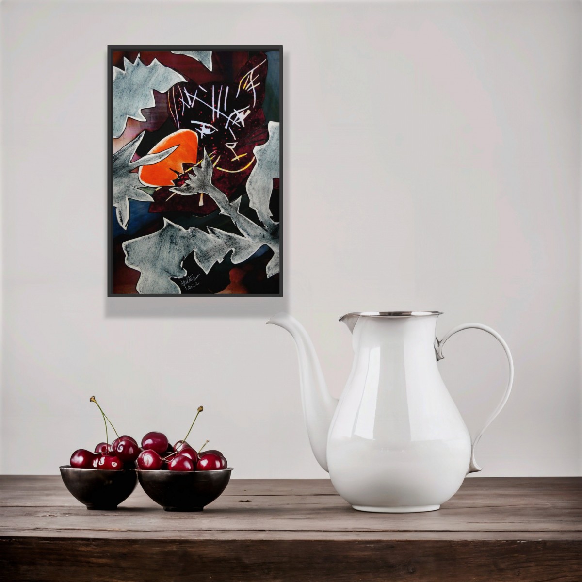 "Chardon et chat" ©alainhalter 2022. Collage de papiers découpés à partir de tirages d'art sur carton. Année : Aubervilliers, 03/2022. Format A3 : 29,7 (largeur) x 42 (hauteur) cm. Encadrement sous-verre avec baguette aluminium noir Nielsen C2. Pièce unique.