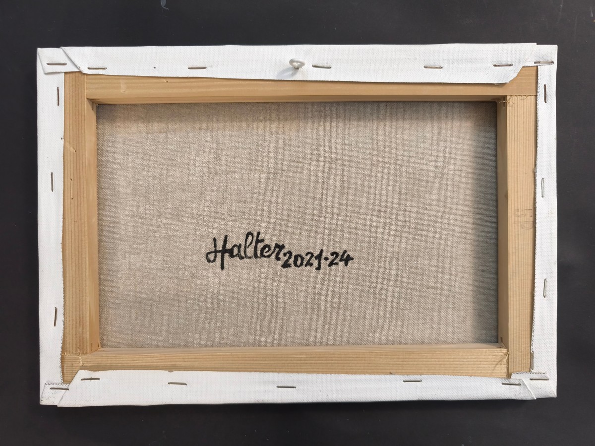 "Chardon vert rouge or" ©alainhalter 2021-2024. Peinture acrylique et pastels à l'huile Sennelier sur toile et châssis. Année : Aubervilliers, novembre 2021, septembre 2024. Format 5P : 35 (largeur) x 24 (hauteur) cm. Signature au verso. Pièce unique. (Les couleurs de la photo sont légèrement amoindries par rapport à l'original en raison de l'utilisation de peintures métalliques). Hors encadrement. Encadrement sur demande avec devis.