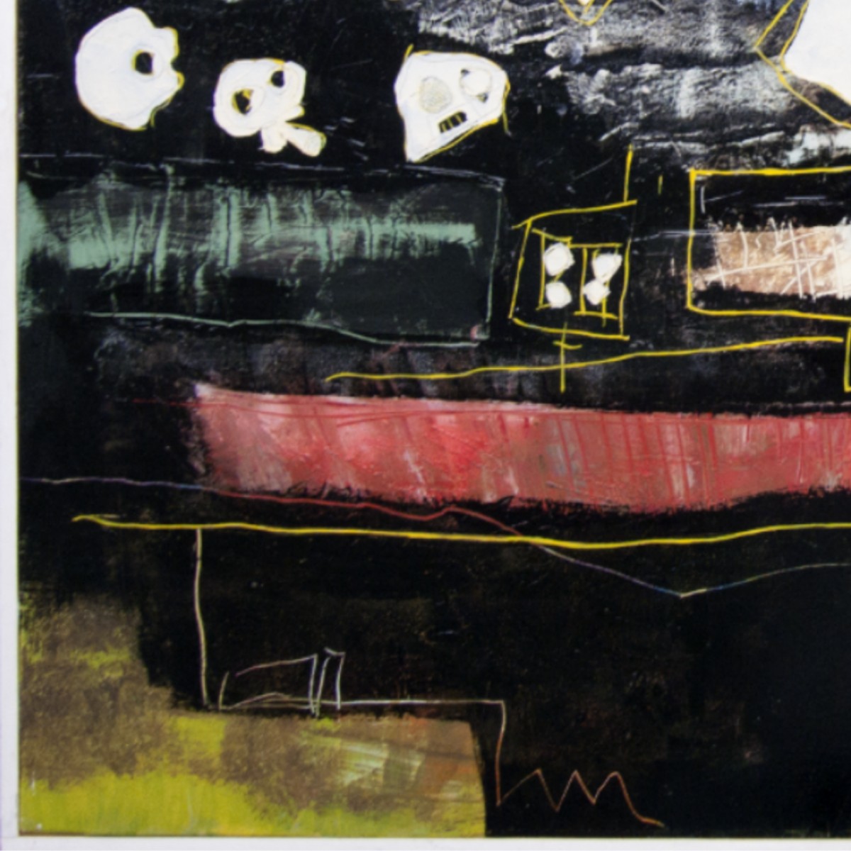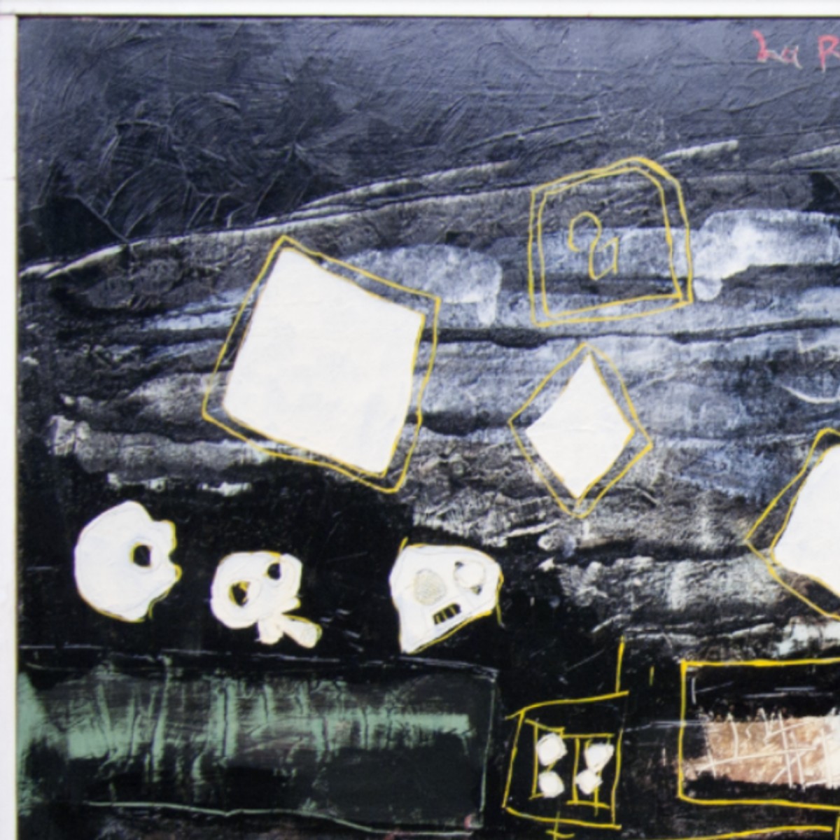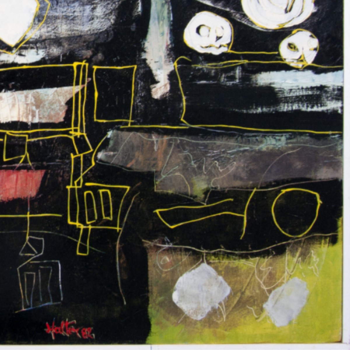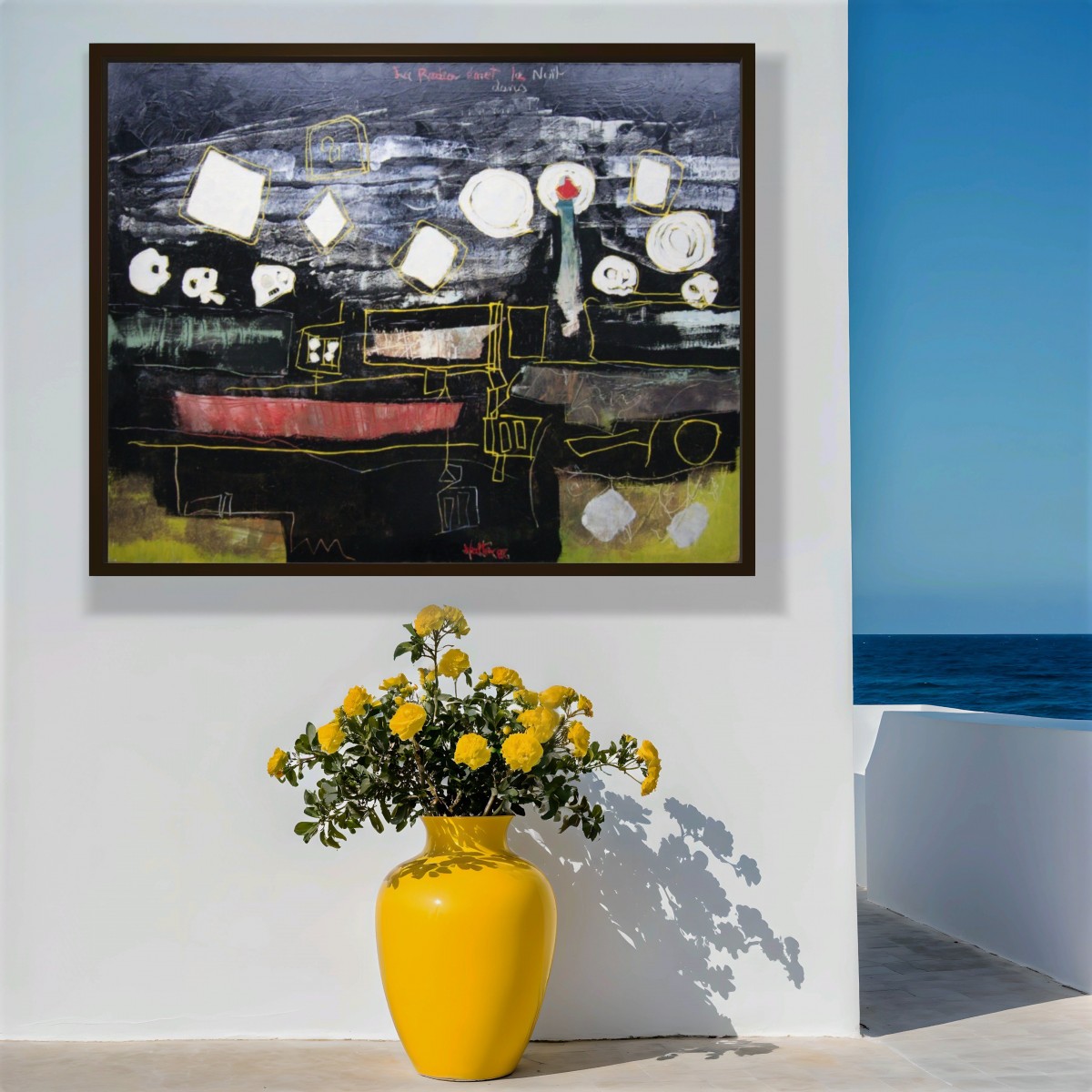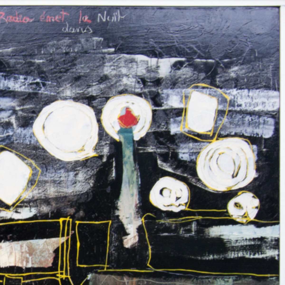 "La radio émet dans la nuit" ©alainhalter 1982. Peinture à l'huile sur toile et châssis. Année : 1982. Format 25F : 81 (largeur) x 65 (hauteur) cm. Encadrement baguette artiste blanc, tranches décorées. Pièce unique.