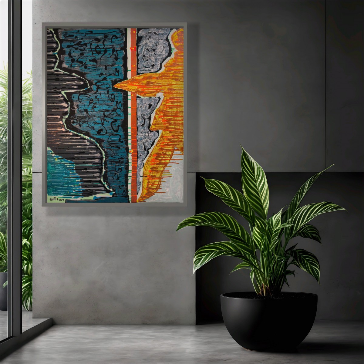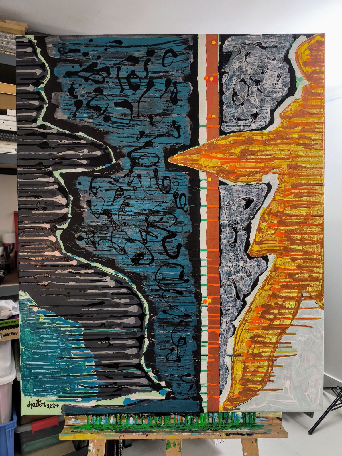 "Ombre vers lumière" ©alainhalter 2024. Peintures acryliques Rembrandt et Amsterdam de Royal Talens, pouring expériences Pébéo acryliques utilisées en coulures contrôlées sur toile montée sur châssis Gerstaecker Classico. Tranches peintes. Année : novembre-décembre 2024. Format (40F) de 81 (largeur) x 100 (hauteur) cm. (Les couleurs de la photo sont légèrement amoindries par rapport à l'original en raison de l'utilisation de peintures métalliques et fluorescentes). Hors encadrement. Pièce unique.