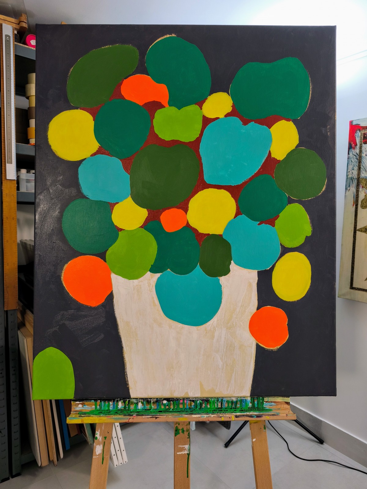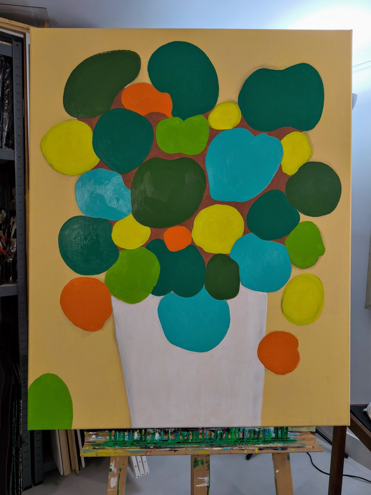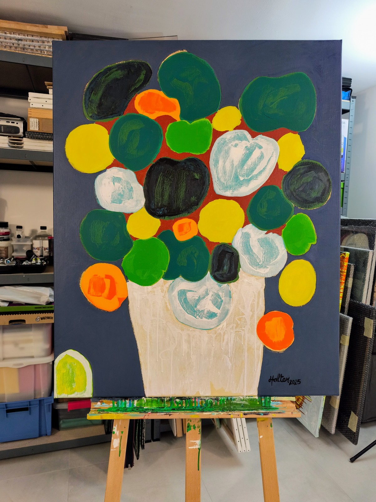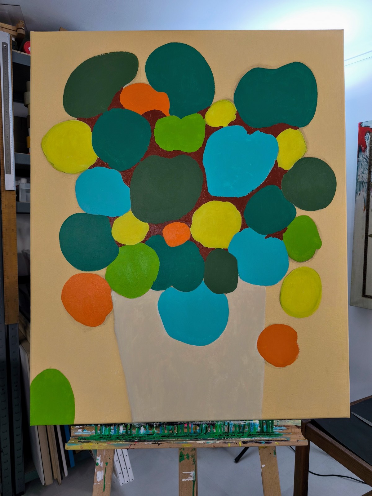 "Plante à monnaie de Chine, acrylique" ©alainhalter 2025. Peintures acryliques Rembrandt et Amsterdam de Royal Talens, pouring expériences Pébéo acryliques sur toile montée sur châssis Gerstaecker Classico. Tranches peintes. Année : décembre 2025. Format (40F) : 81 (largeur) x 100 (hauteur) cm. Hors encadrement. Pièce unique.