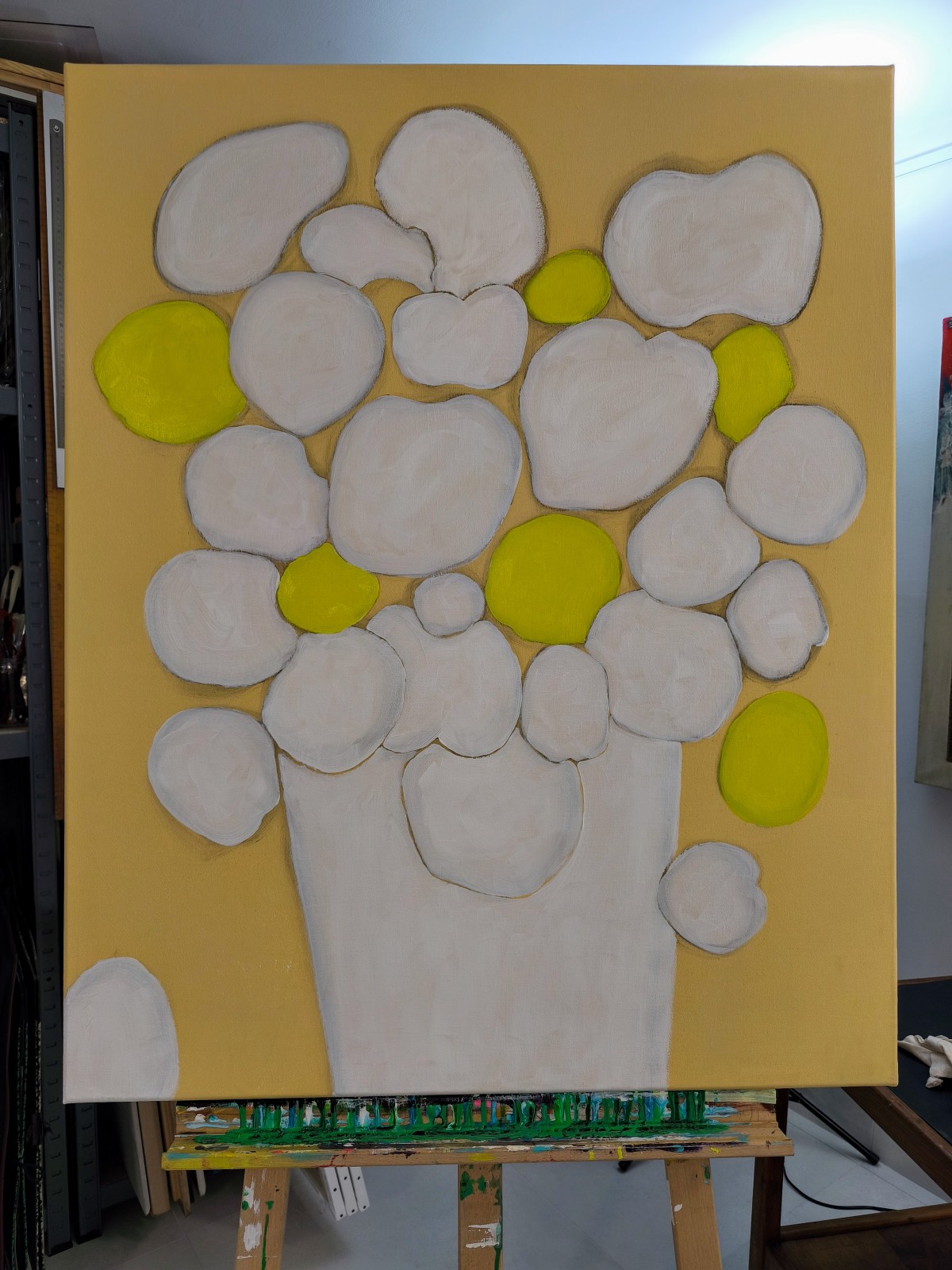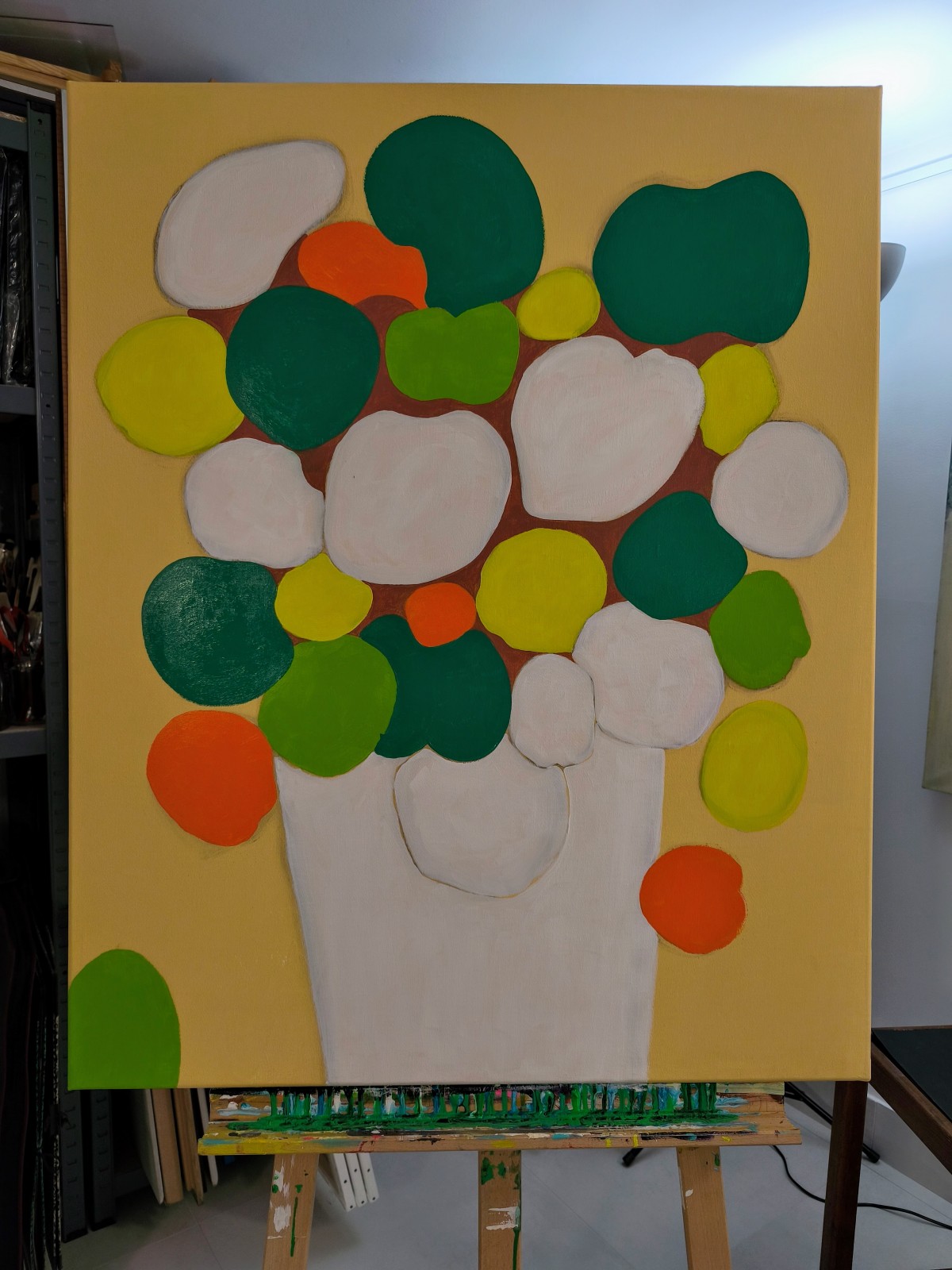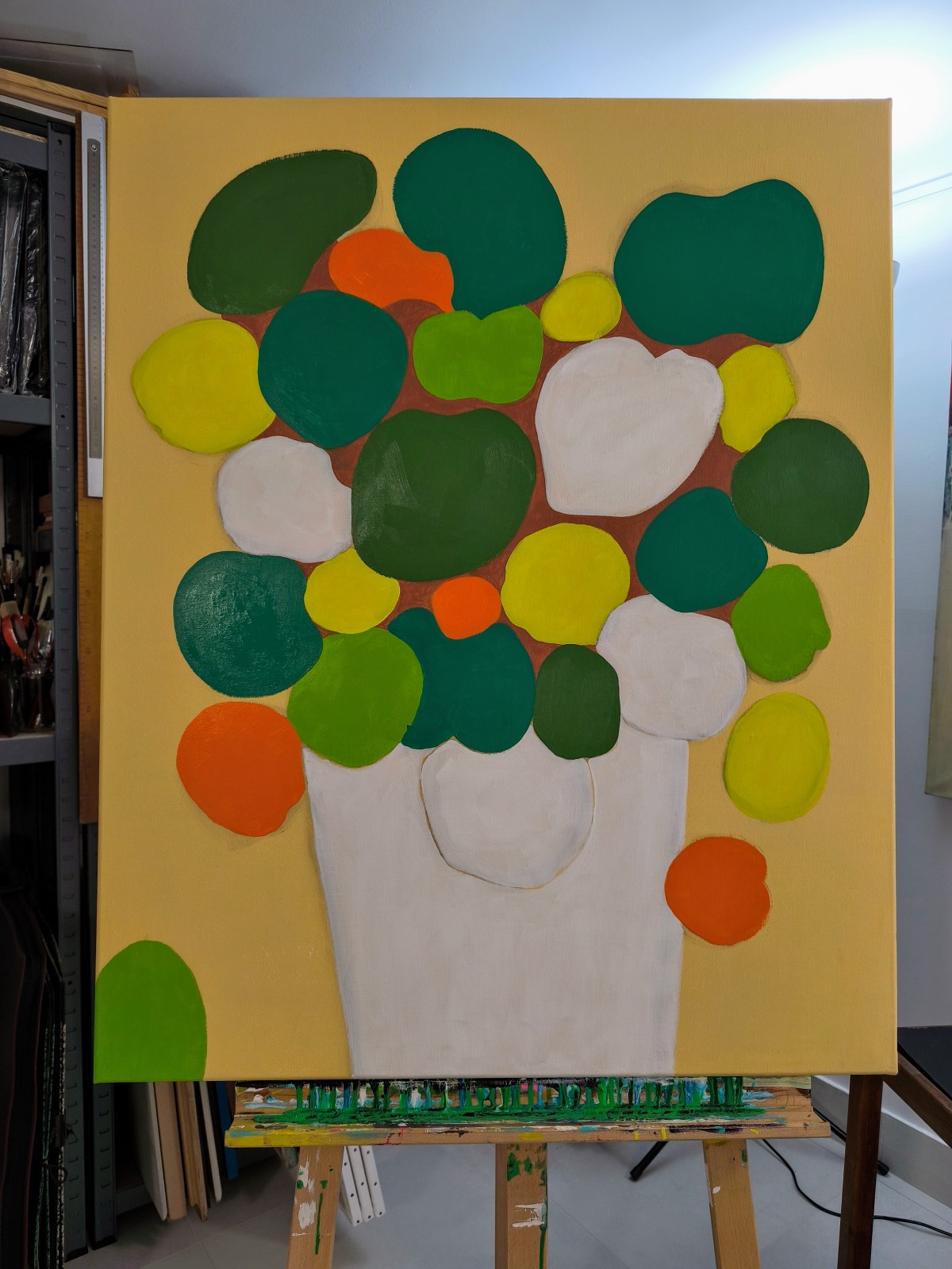 "Plante à monnaie de Chine, acrylique" ©alainhalter 2025. Peintures acryliques Rembrandt et Amsterdam de Royal Talens, pouring expériences Pébéo acryliques sur toile montée sur châssis Gerstaecker Classico. Tranches peintes. Année : décembre 2025. Format (40F) : 81 (largeur) x 100 (hauteur) cm. Hors encadrement. Pièce unique.