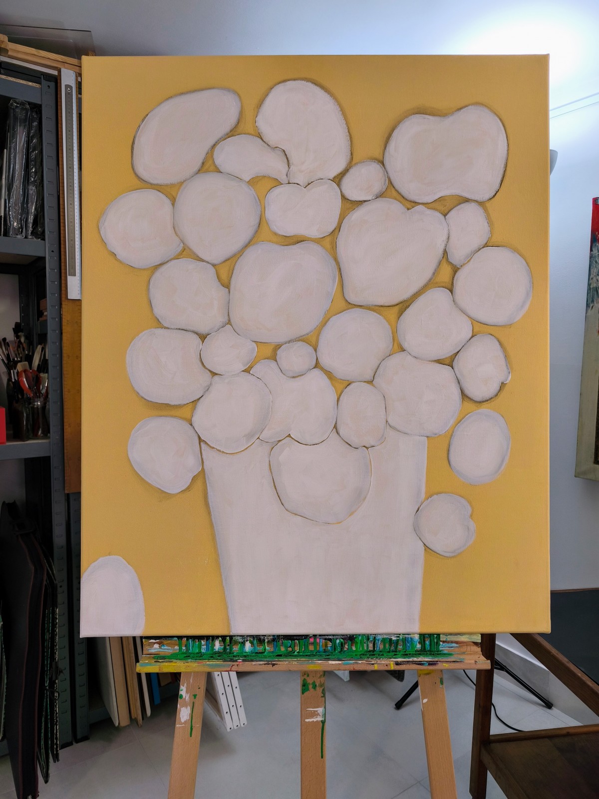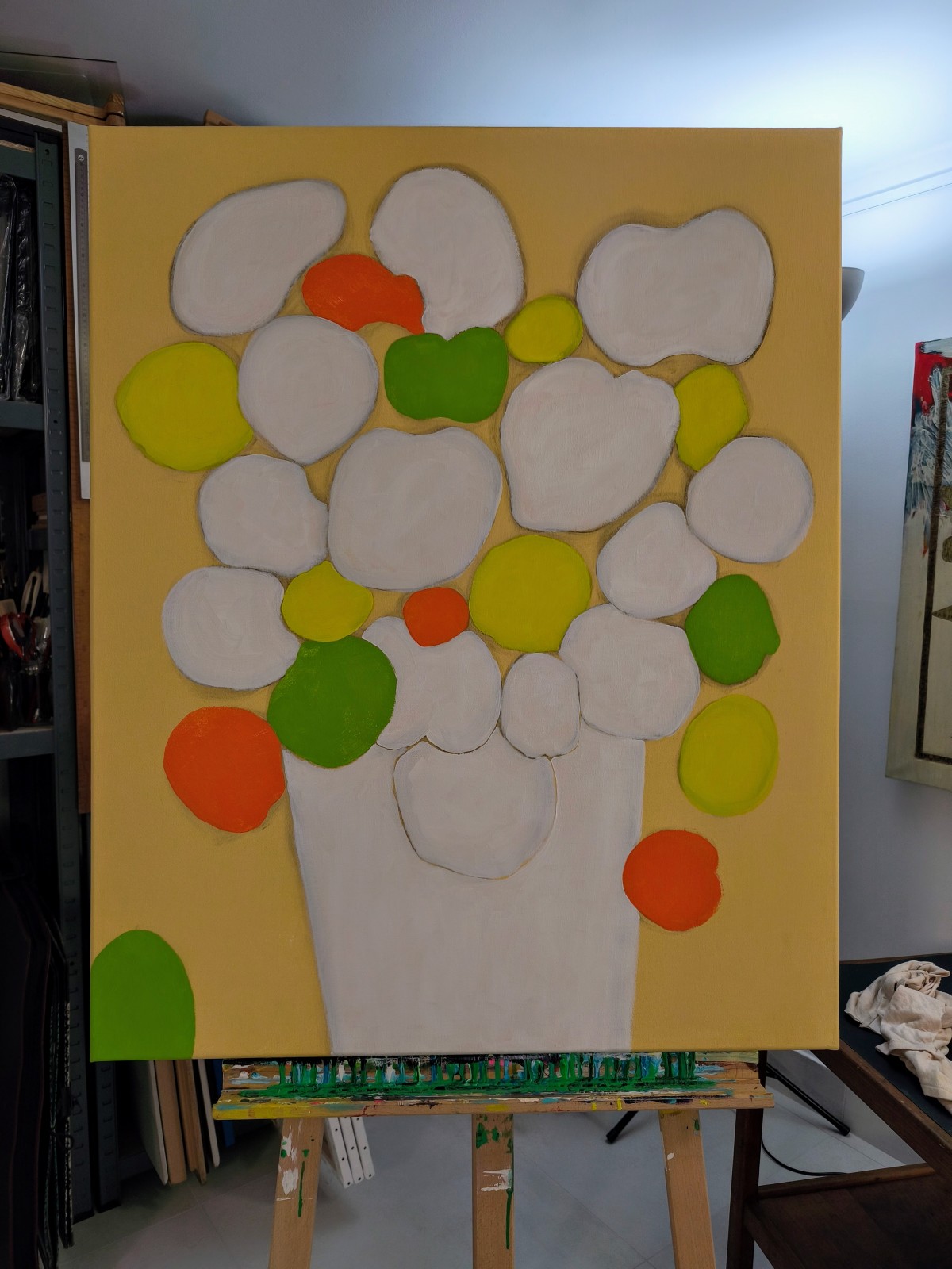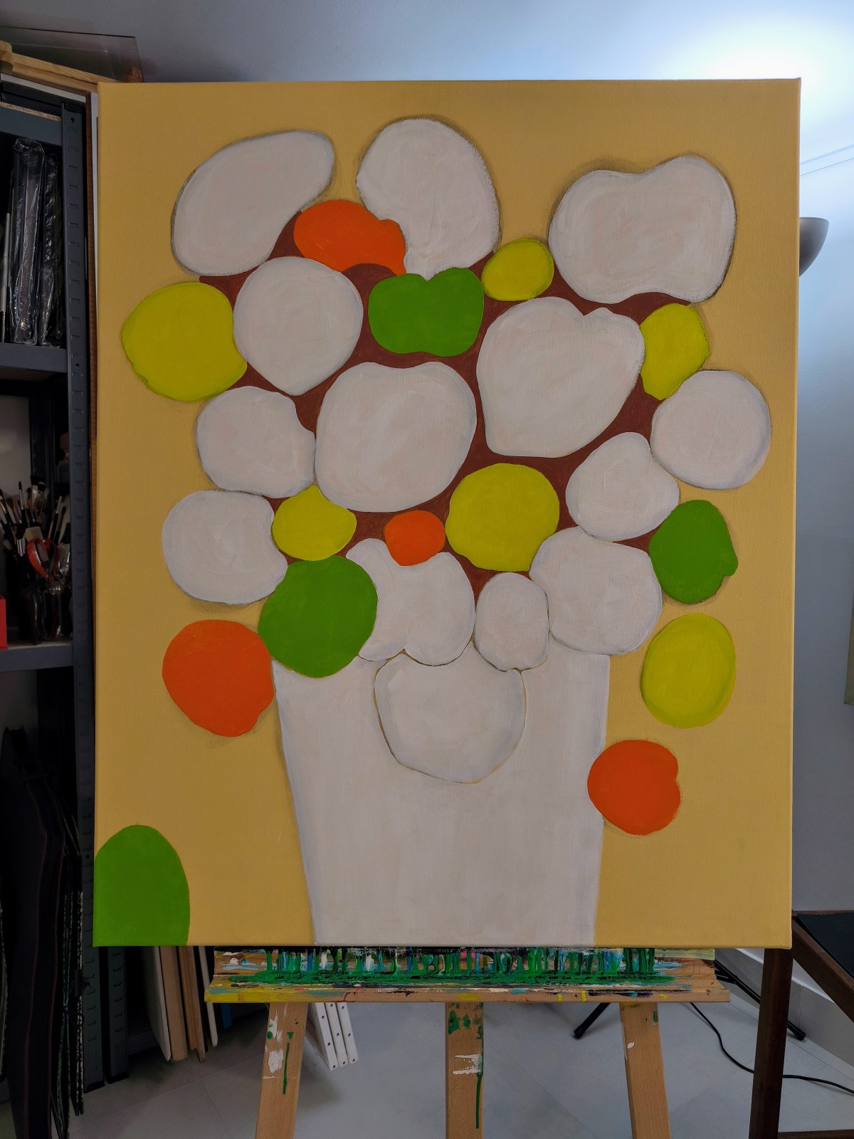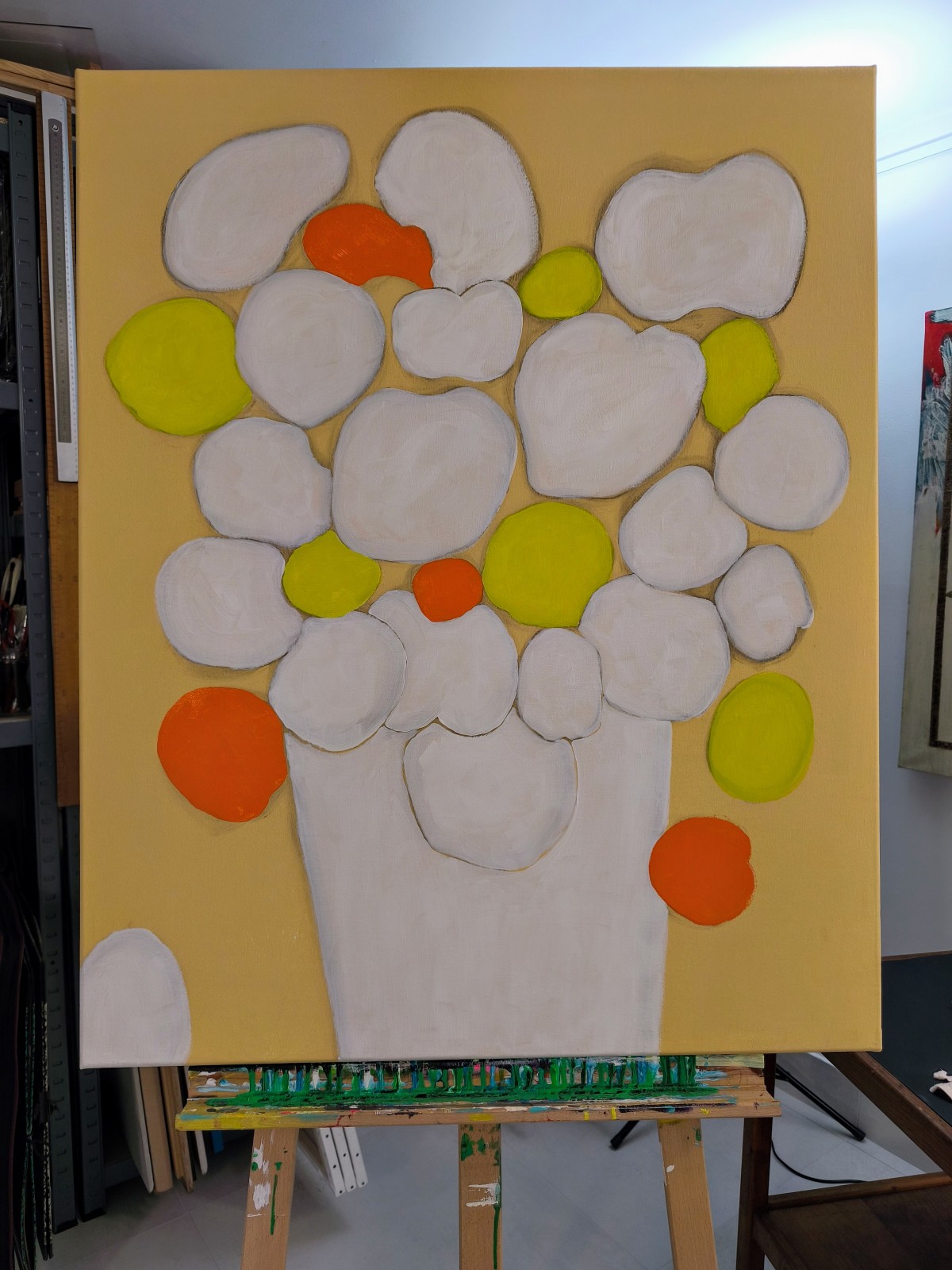 "Plante à monnaie de Chine, acrylique" ©alainhalter 2025. Peintures acryliques Rembrandt et Amsterdam de Royal Talens, pouring expériences Pébéo acryliques sur toile montée sur châssis Gerstaecker Classico. Tranches peintes. Année : décembre 2025. Format (40F) : 81 (largeur) x 100 (hauteur) cm. Hors encadrement. Pièce unique.