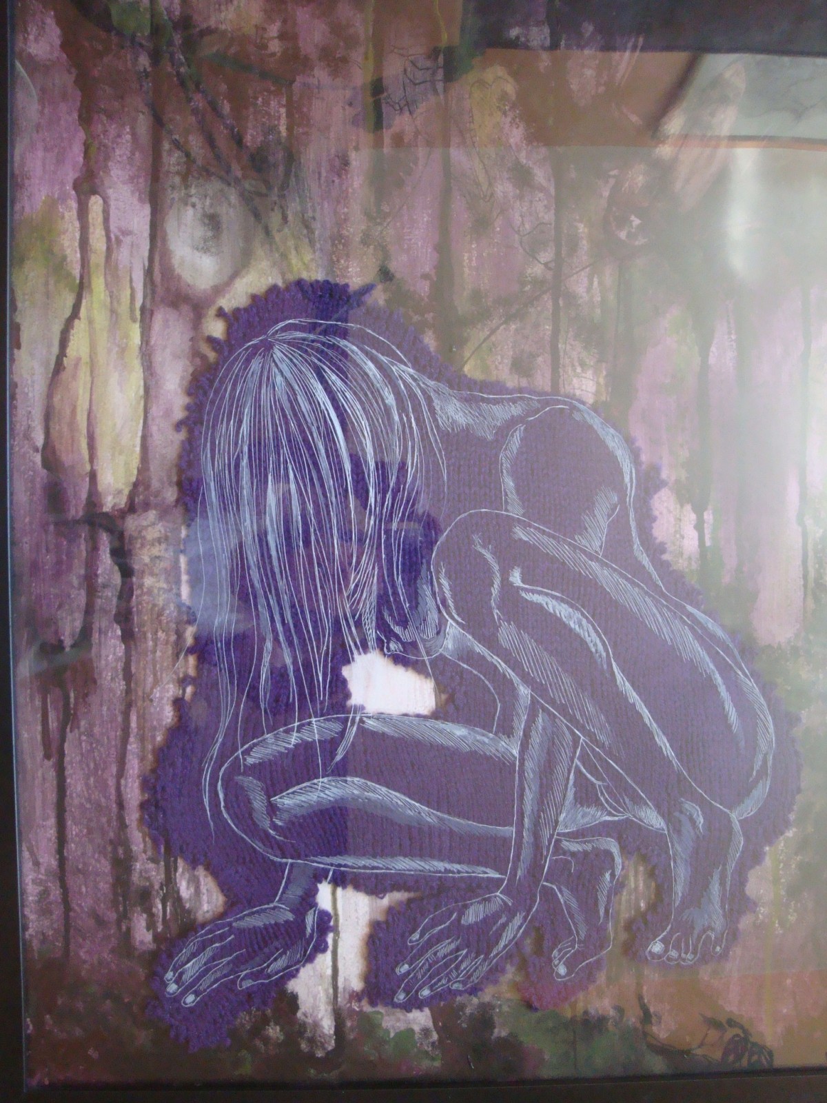Crée a partir de rste de laine violet , le dessin est gravé sur plexi , le fond en acrylique.