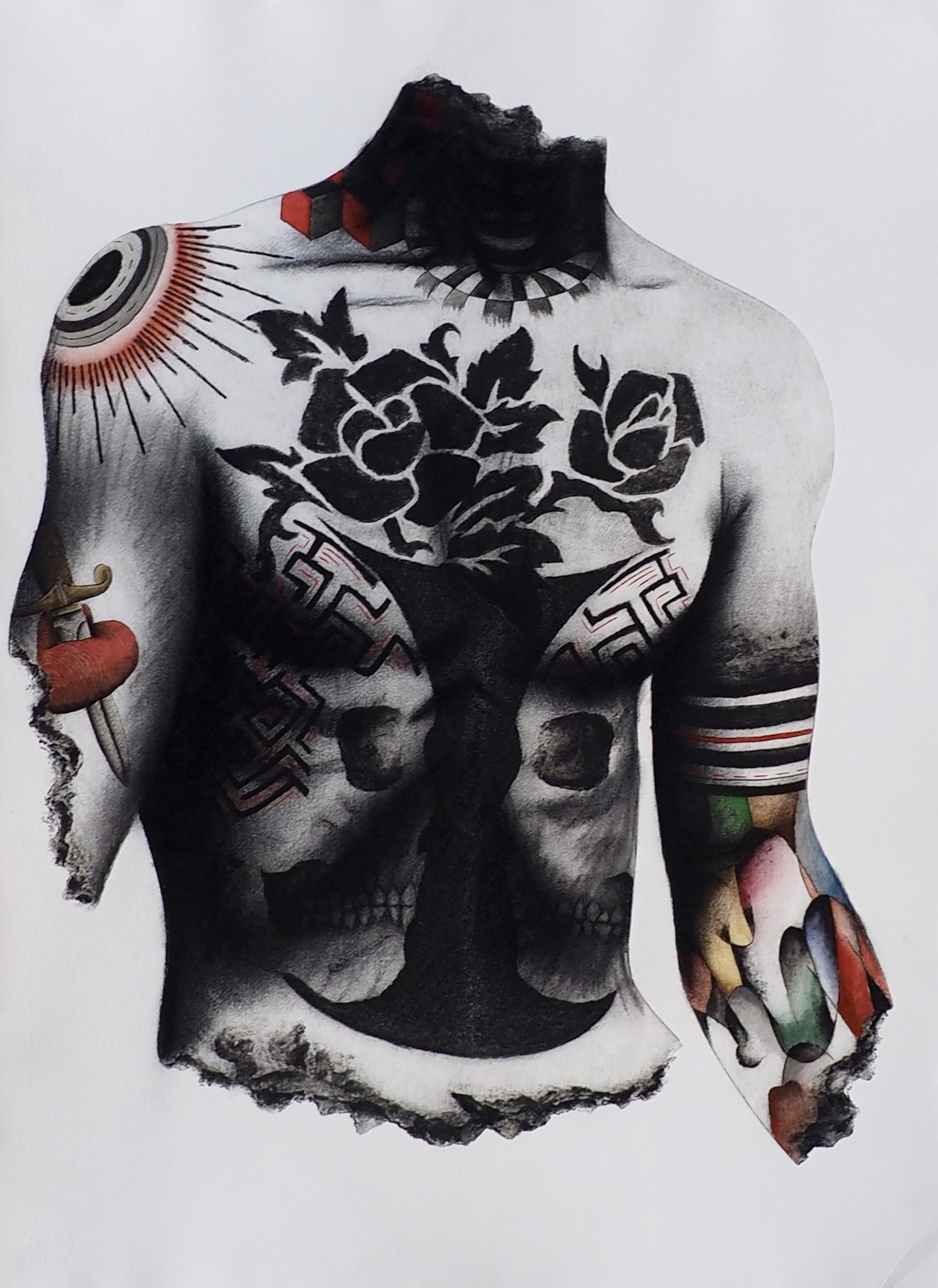 gravure sur carton, fusain, pierre noire et aquarelle