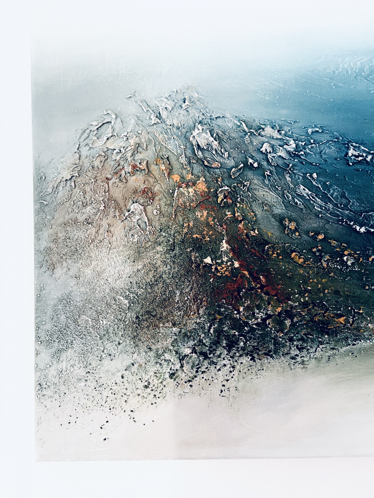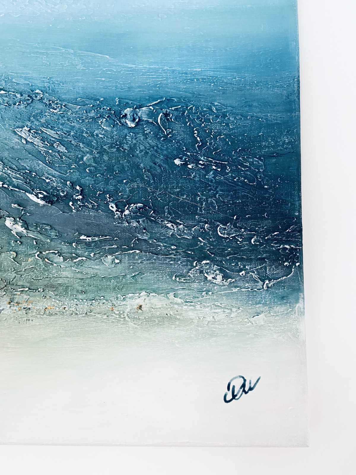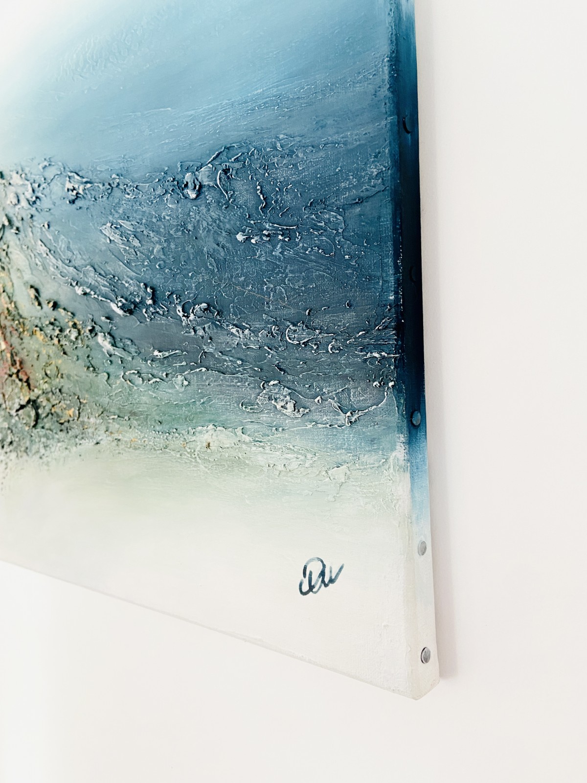 This painting was born from an inner need to find peace and lightness. While creating it, the artist sought to express the kind of silence where thoughts fade away. Soft blue and turquoise tones reflect a state of clarity and trust in life. Textured paste adds depth, as if the wind’s breath moves across the canvas. Acrylic transitions create a gentle glow — like the reflection of the sky on water.