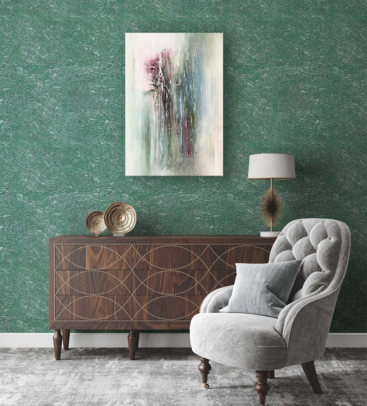 Structural paste is applied to a 55cm x 38cm canvas, then acrylic paint, and a protective layer of varnish completes the painting.