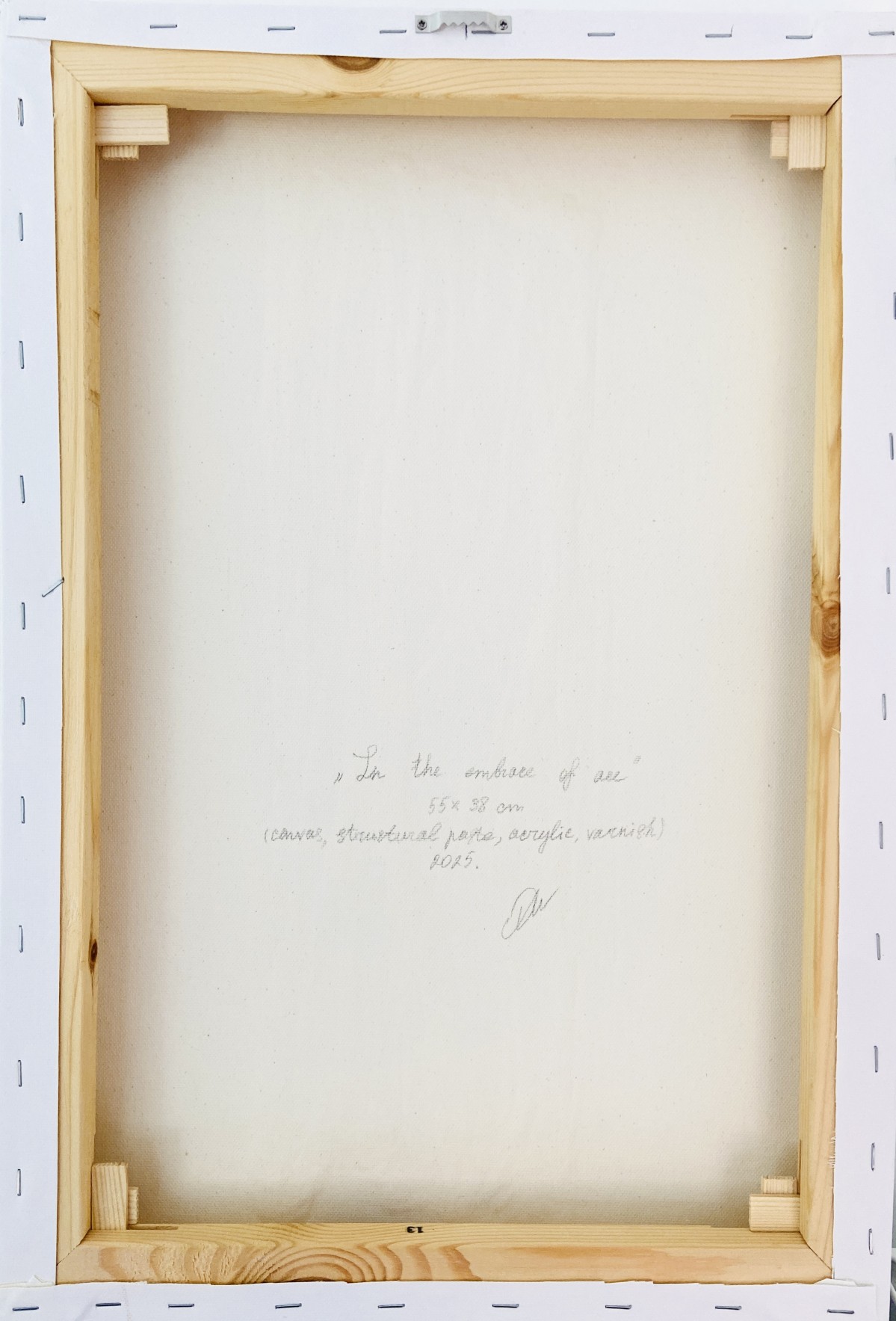 On the canvas unfolds the story of a rose held in icy embrace. Its petals, fragile and alive, seem caught in a moment of eternity. The artist conveys the breath of winter, where cold surrounds warmth but never defeats it. Textured paste creates the effect of frozen streams — as if crystals of ice touch the light. The blend of pink and soft blue-gray tones evokes calm and depth. This work speaks of inner strength — of beauty that survives even in silence and frost. In every brushstroke lives the wish to preserve tenderness amid the ice. The painting was born from quiet solitude and gentle hope. It reminds us that even when the world feels cold, the heart keeps glowing. A symbol of the soul’s resilience, sheltered beneath a veil of ice.