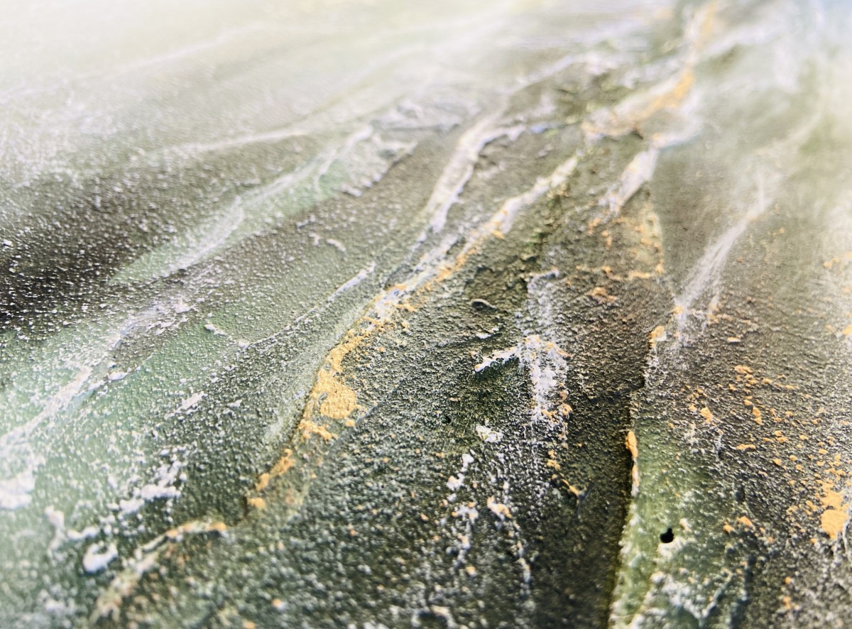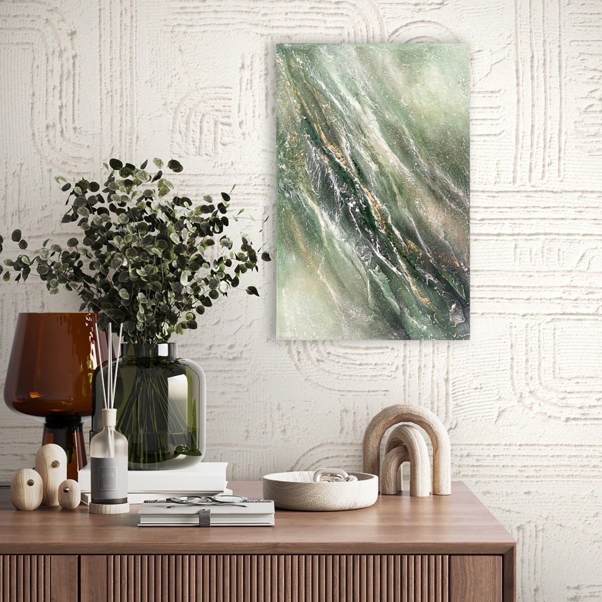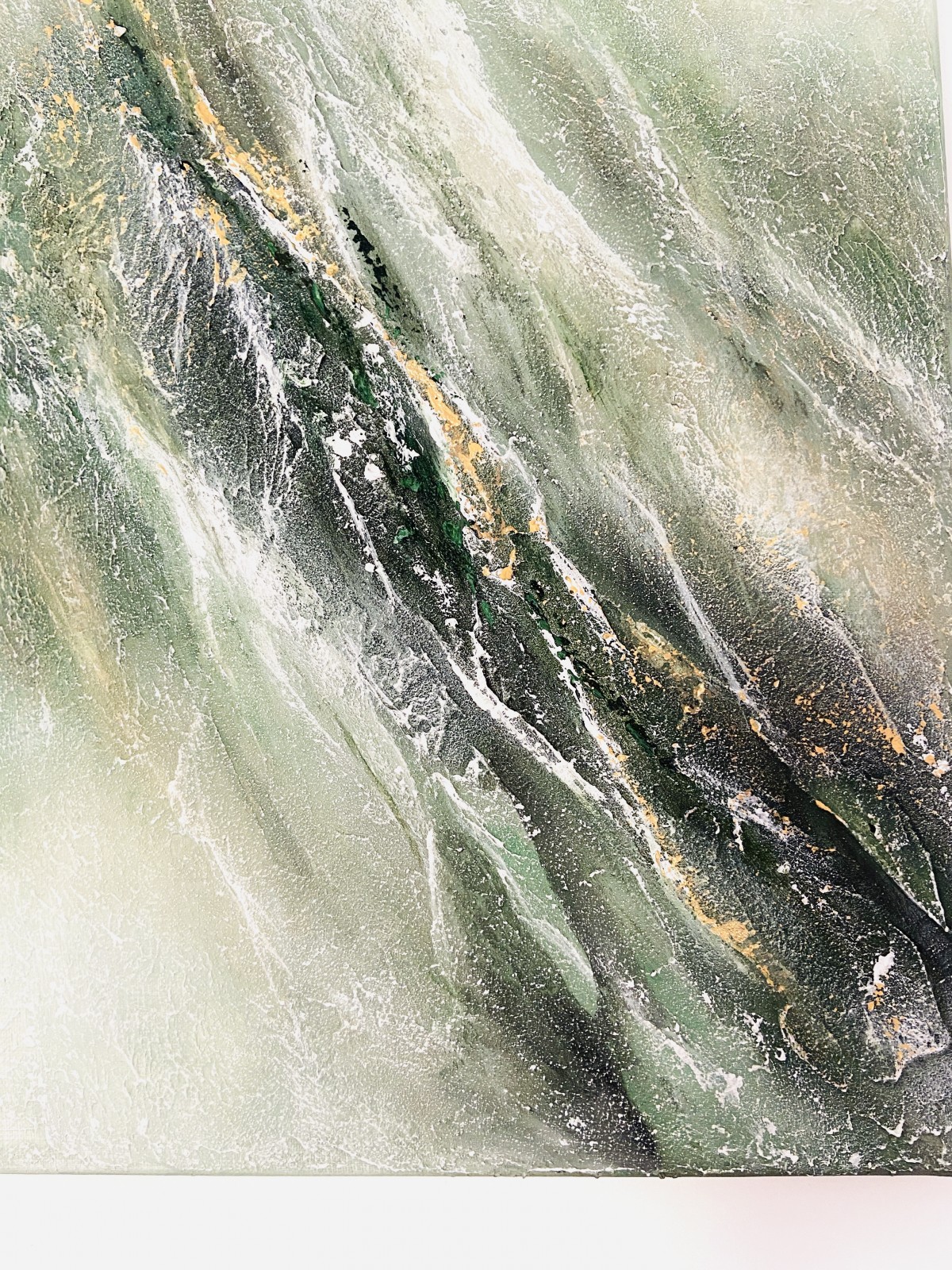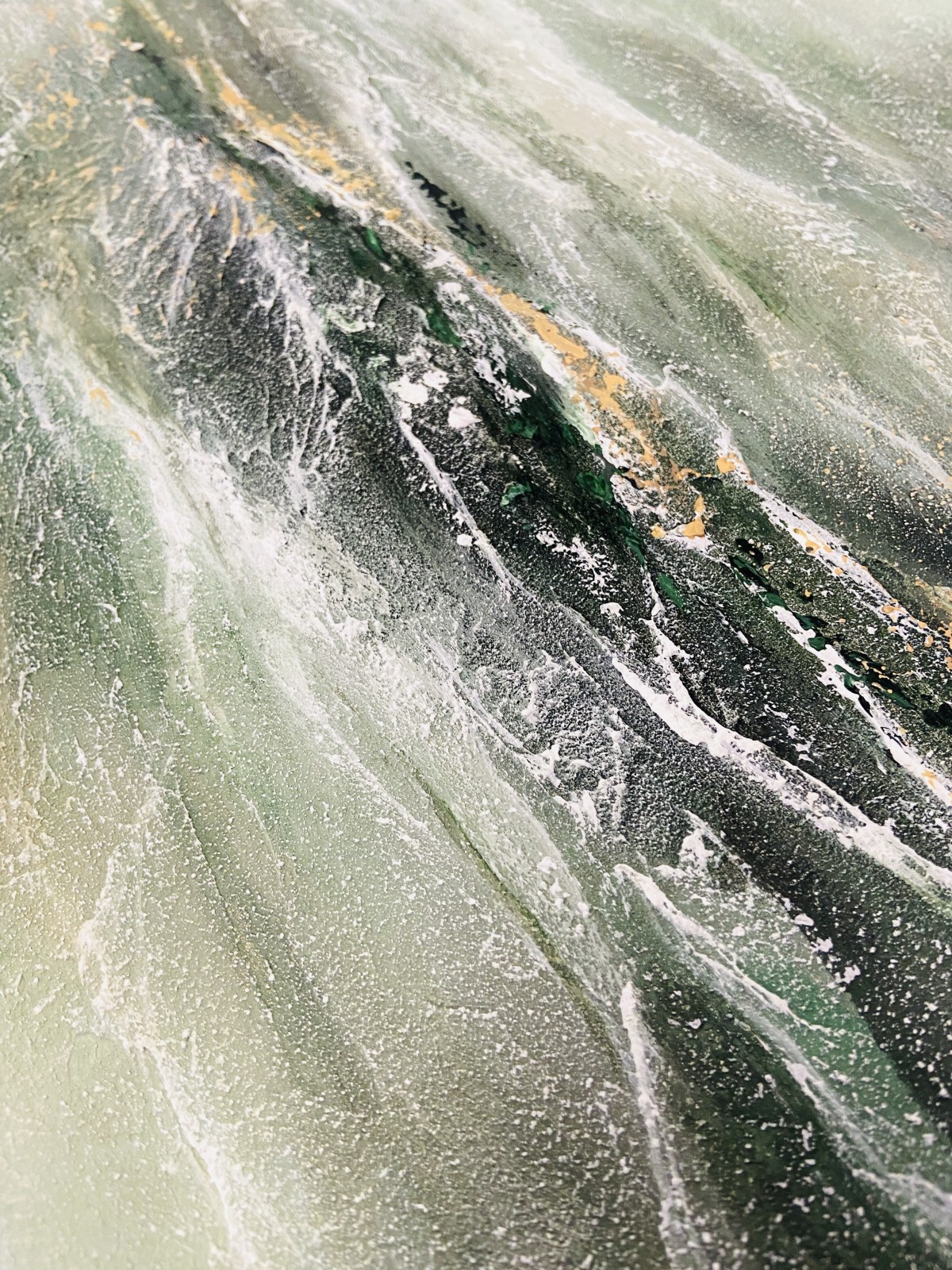 The textures resemble a wave frozen inside a stone surface. Delicate white lines look like traces of water passing through rock. Shades of green bring a sense of depth and calm. Golden touches add warmth and a hint of sunlight.