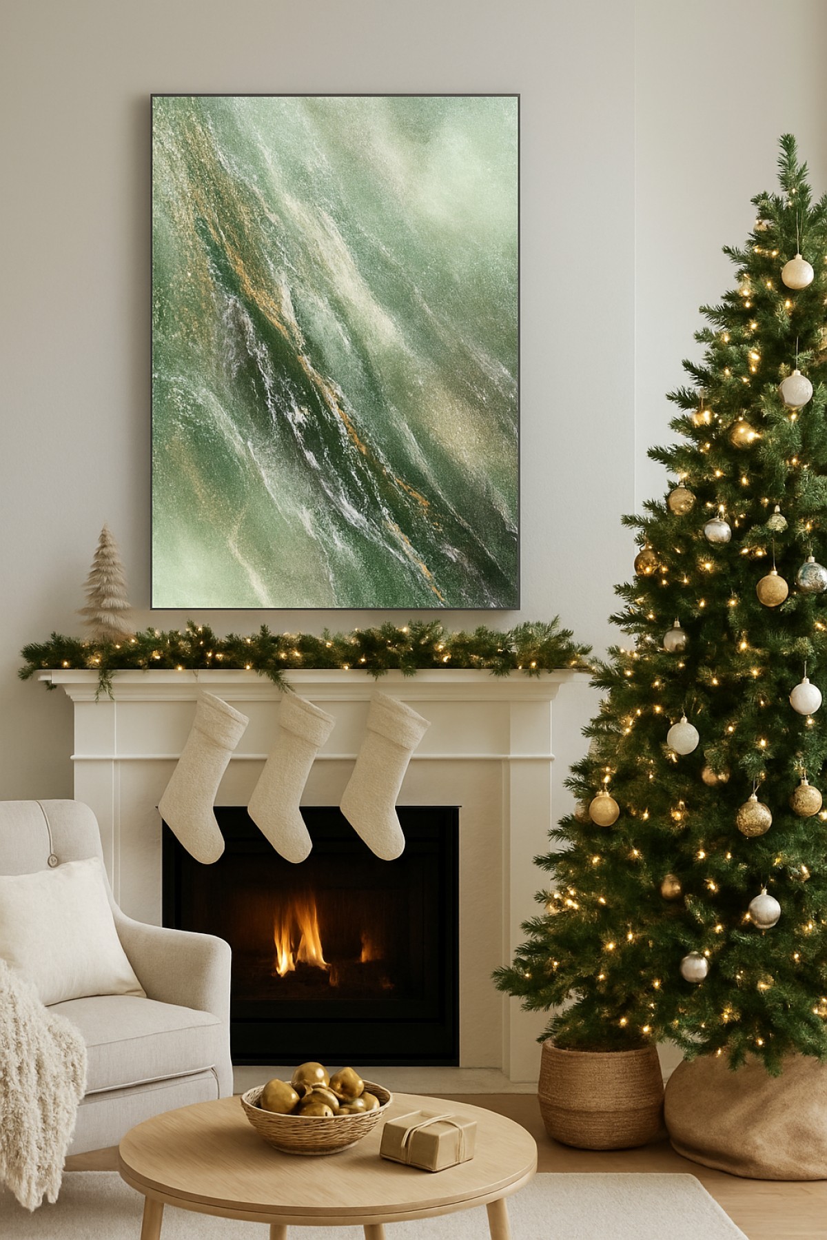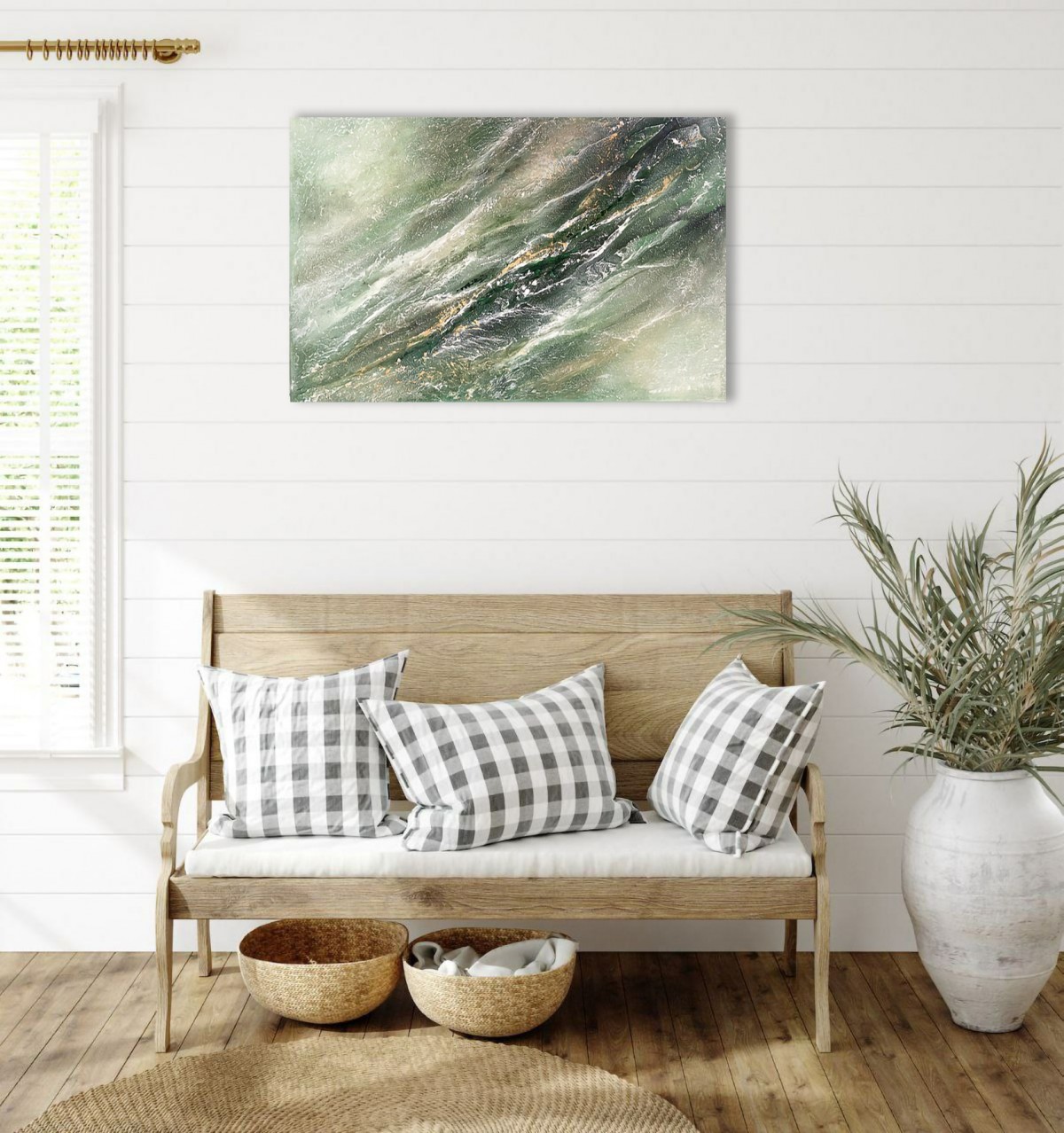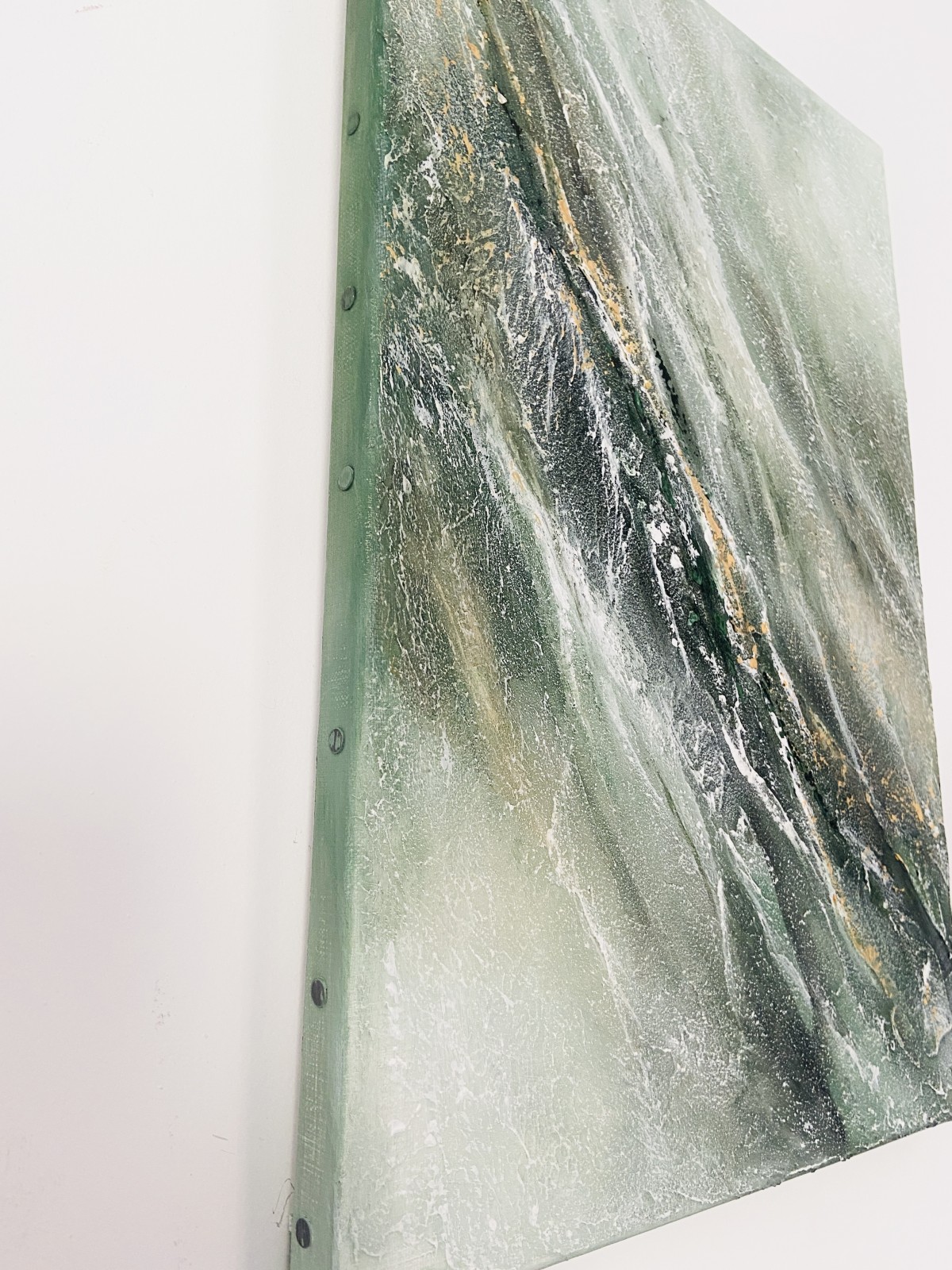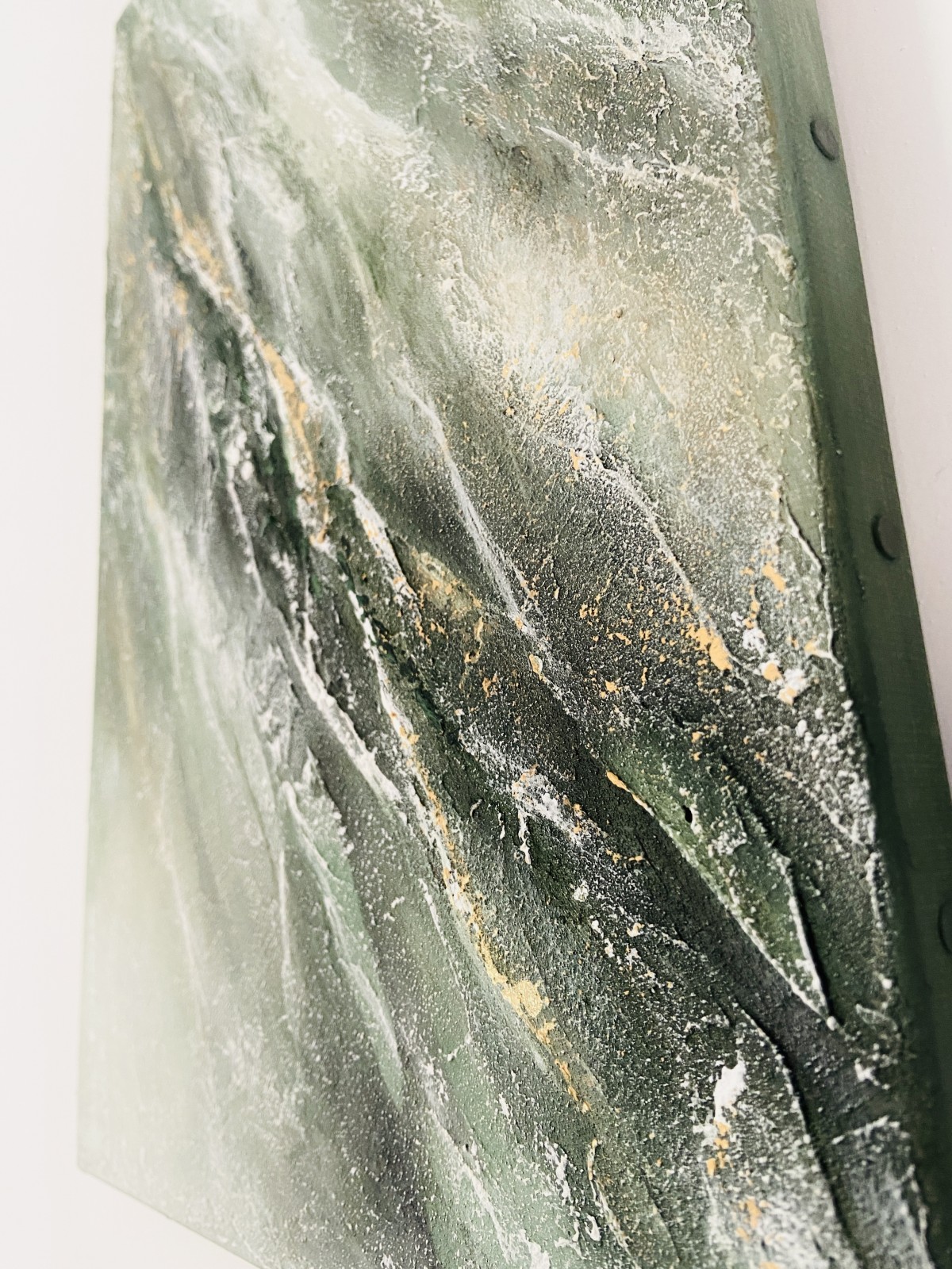 The textures resemble a wave frozen inside a stone surface. Delicate white lines look like traces of water passing through rock. Shades of green bring a sense of depth and calm. Golden touches add warmth and a hint of sunlight.