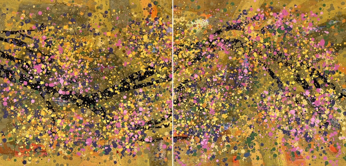 This contemporary abstract painting, created with acrylic on canvas, radiates vibrant energy through layered splashes and dynamic textures. The interplay of bold black strokes with scattered multicolored droplets evokes movement and spontaneity. Its golden background adds warmth and depth, suggesting both chaos and harmony. The composition invites viewers to interpret emotion, rhythm, and the expressive freedom of modern abstract art.