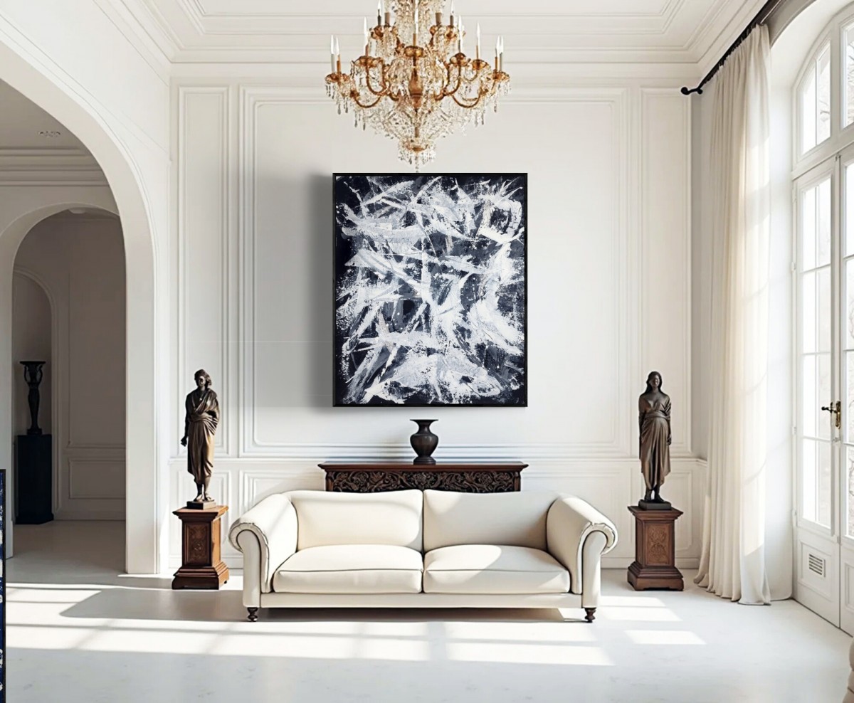 Peinture abstraite de format 100/81 cm , dans la mouvance de l’expressionnisme abstrait de Pollock et de l'action peinture ou c'est le geste qui créé l’œuvre, le résultat est vivant et dynamique . Du blanc en surface sur un fond de dégradé de gris.