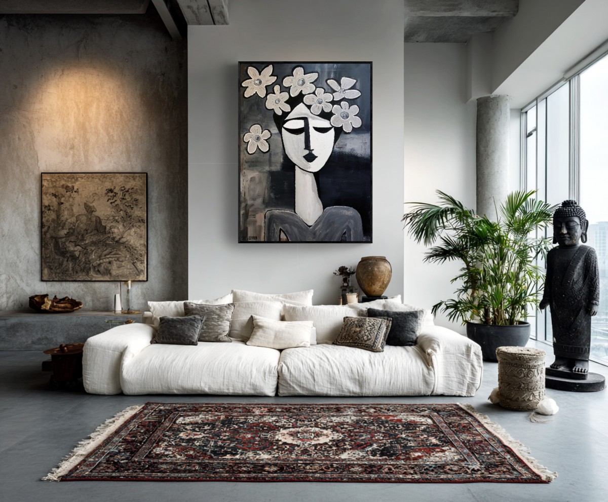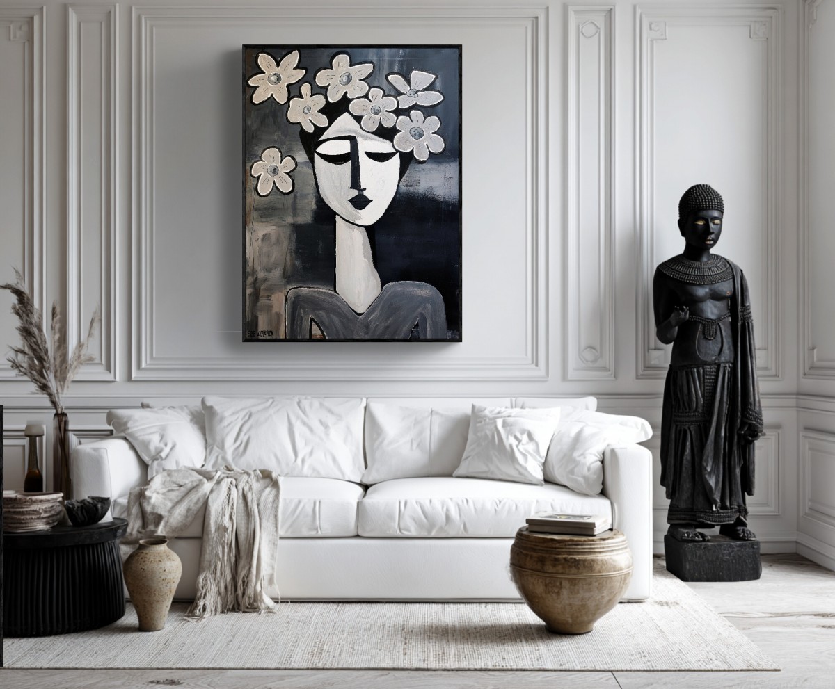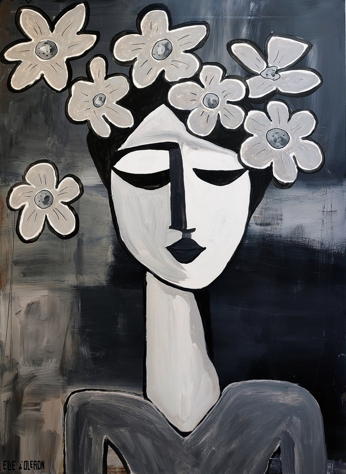 Un portrait avec un peu de cubisme et de Matisse, abstrait mais figuratif, en tout cas moderne et sensible, acrylique sur toile format 100/80 cm .