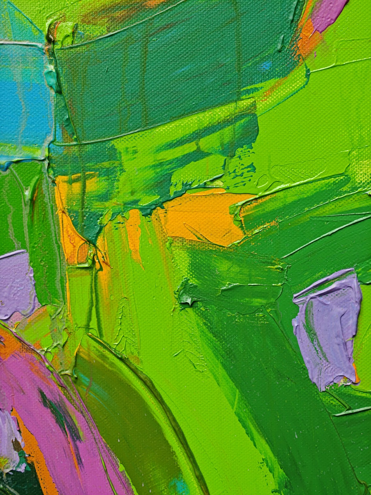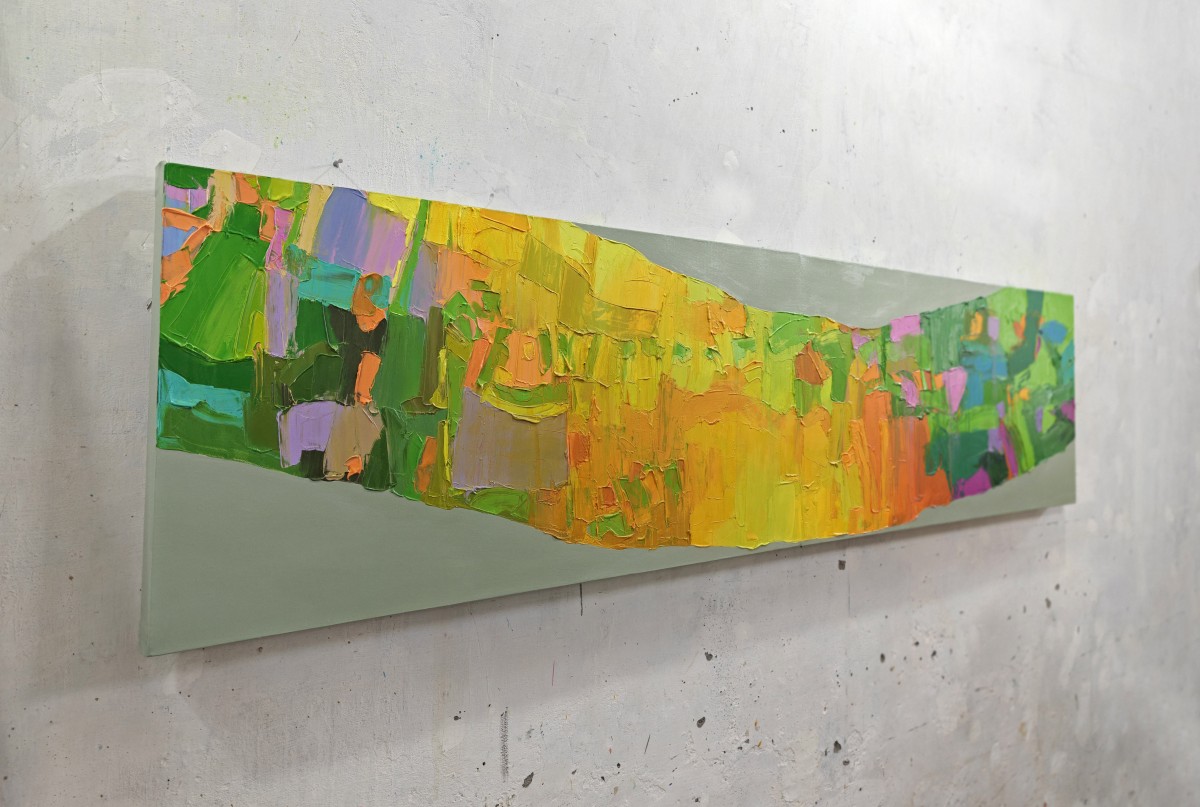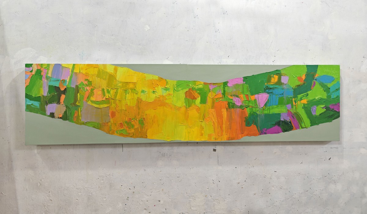 The thick knife textures create a tactile surface, adding depth and rhythm to the piece. Its panoramic size and dynamic color transitions make it a striking statement artwork, ideal for expansive interiors. Shipped rolled for convenience.
