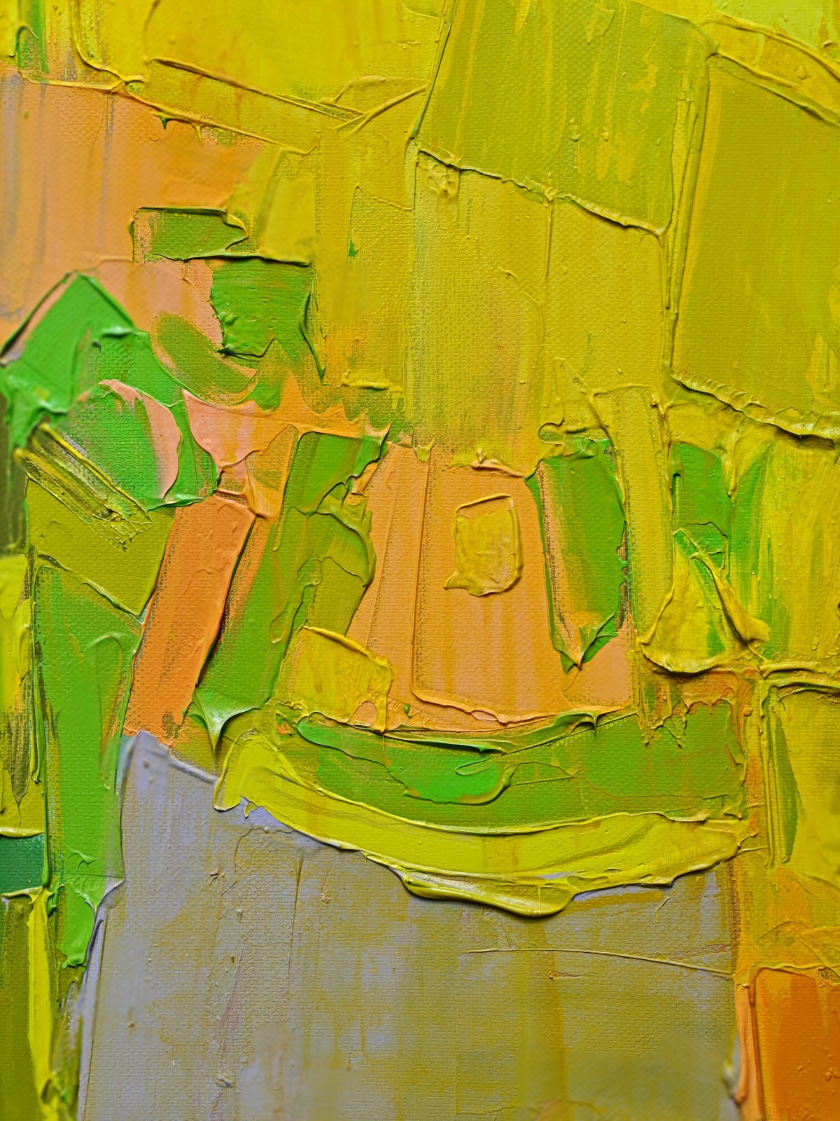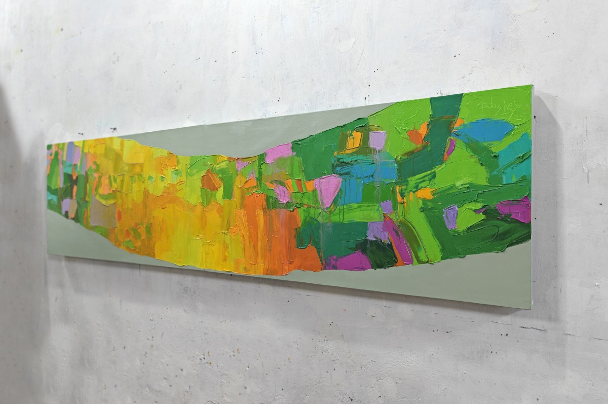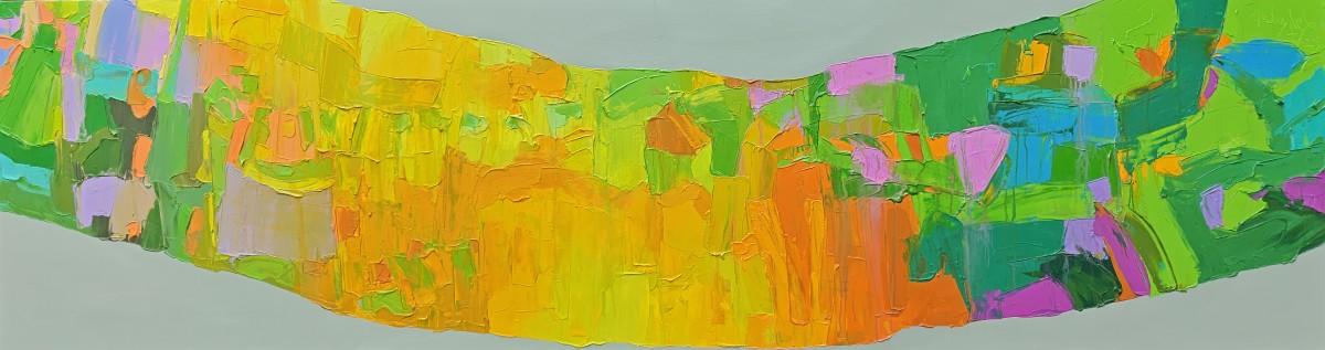 This vibrant large-scale acrylic painting (2 x 8 feet) created with a palette knife captures the essence of nature and human life intertwined. The sweeping form across the canvas resembles the curve of a tree trunk, symbolizing strength, growth, and the passage of time. The radiant yellows and oranges evoke the warmth of sunrise, while lush greens, cool blues, and soft violets reflect the shifting moods of both urban and village landscapes. The work embodies the harmony of changing seasons, the dialogue between tradition and modernity, and the ever-evolving cycle of life.