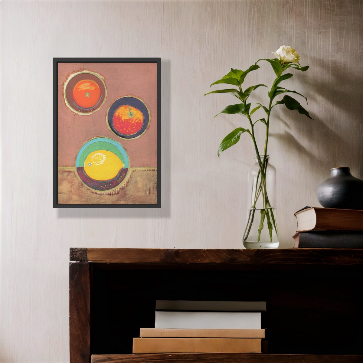 "Fruits ronds" ©alainhalter 20244. Collage de cartons, marqueurs et peinture acryliques. Année : Aubervilliers, avril 2024. Format A4 : 21 (largeur) x 29,7 (hauteur) cm. Encadrement Gerstaecker Umbria en bois noir avec verre. Pièce unique.