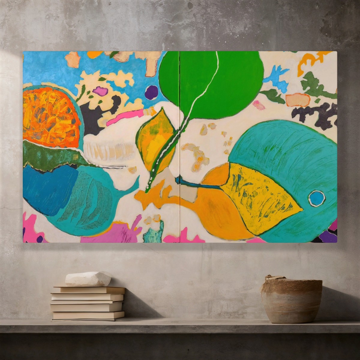 “Quatre feuilles, acrylique” (d’après diapographique #52) ©alainhalter 2025. Peintures acryliques Rembrandt et Amsterdam de Royal Talens, pouring expériences Pébéo acryliques sur toile montée sur châssis Gerstaecker Classico. Tranches peintes. Année : décembre 2025. Format (40F x2) : 162 (largeur) x 100 (hauteur) cm. Hors encadrement. Pièce unique.
