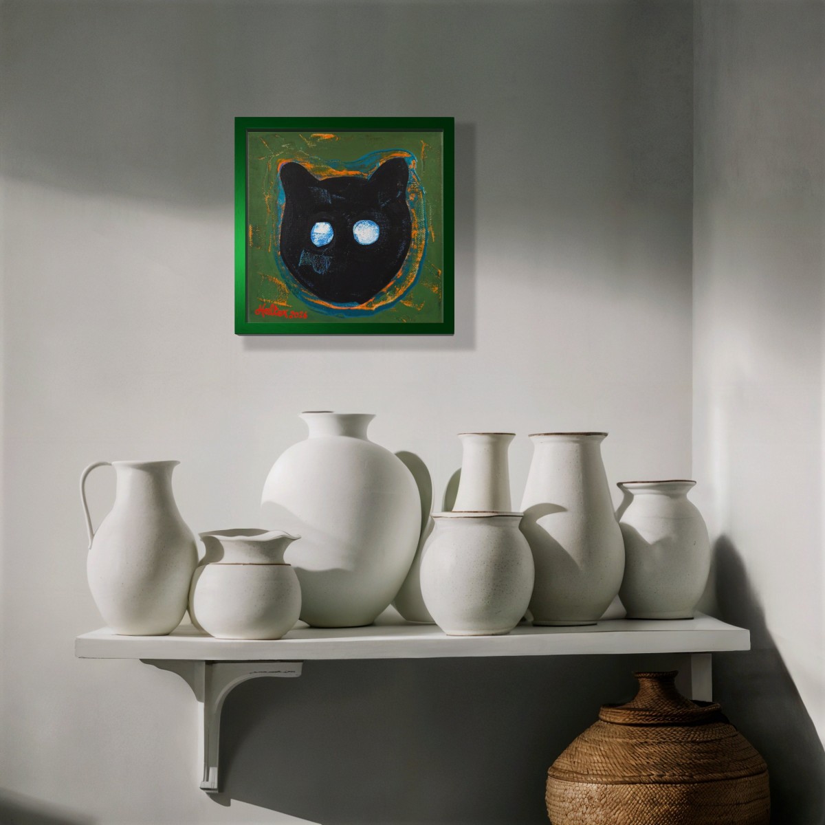 "Tête de chat noir aux yeux de verre" ©alainhalter 2026. Peintures acryliques Rembrandt et Amsterdam de Royal Talens, pouring expériences Pébéo acryliques sur toile montée sur châssis Gerstaecker Classico. Tranches peintes. Année : janvier 2026. Format : 20 x 20 cm. Hors encadrement. Pièce unique.
