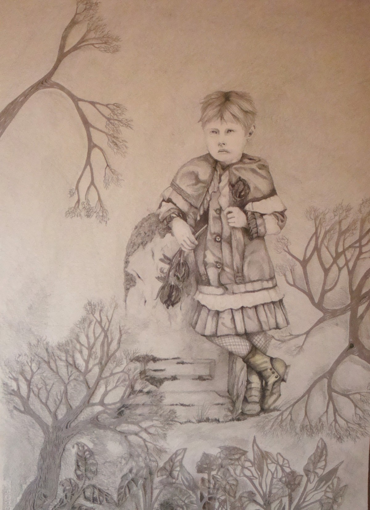 série d' enfants inspirés par des photos anciennes , des bas résilles pour un côté gothique, cherhez l'oiseau . ,dessin et papier découpé .