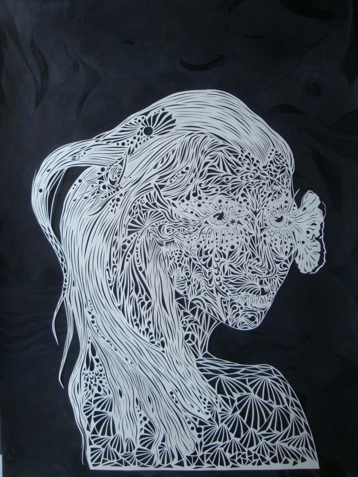 découpé dans des papier de récupération le visage est découpé au cutter et placé sur un fond de pastel c' est un ancien dessin récupéré et recyclé