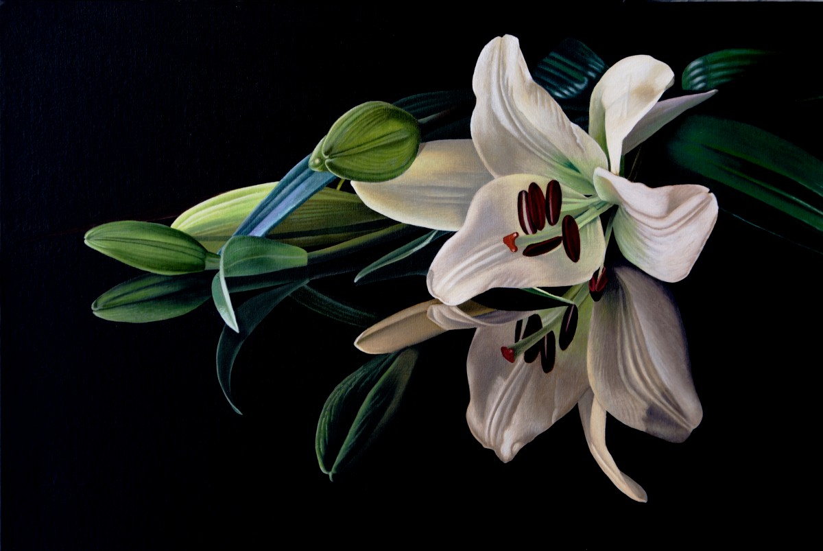 An artist - may he be a painter or a poet - can tell a lot of things with flowers. For centuries flowers and blossoms have been symbols of purity and innocence. In this painting a bunch of lilly blossoms lay on a reflecting surface. The viewer can see the real flowers (their being) as well as their reflection (their appearance). What is reality? What is appearance?