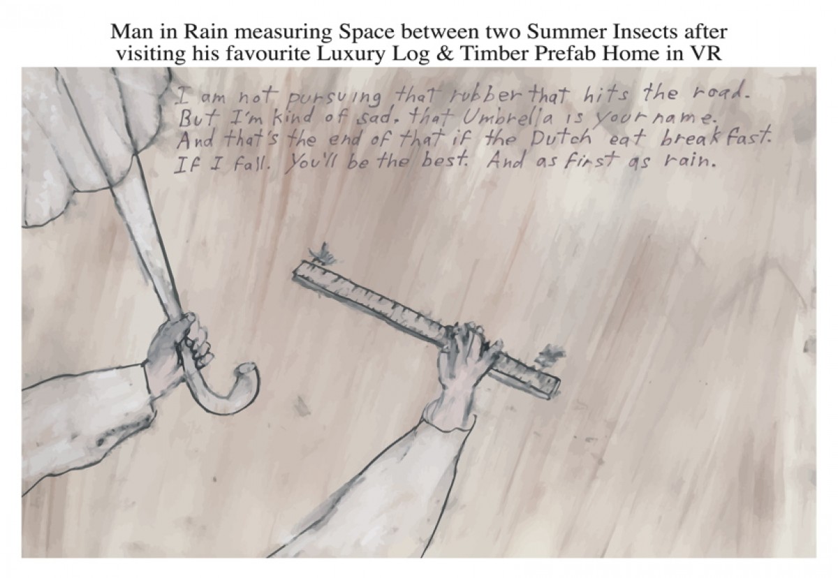 Man in Rain measuring Space between two Summer Insects after visiting his favourite Luxury Log & Timber Prefab Home in VR