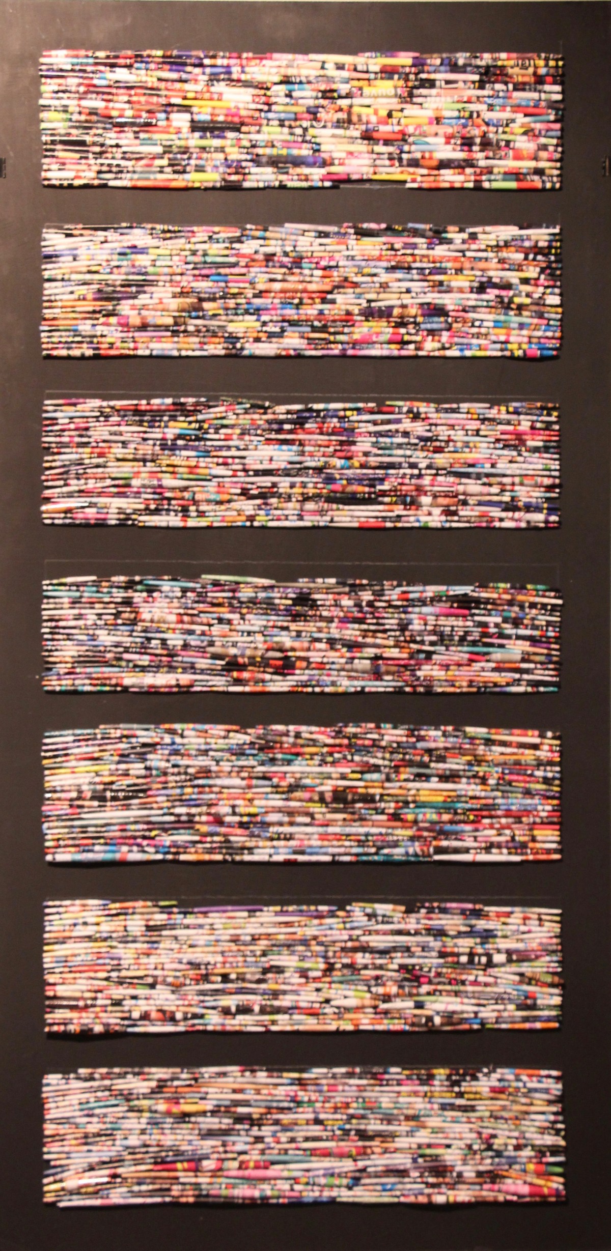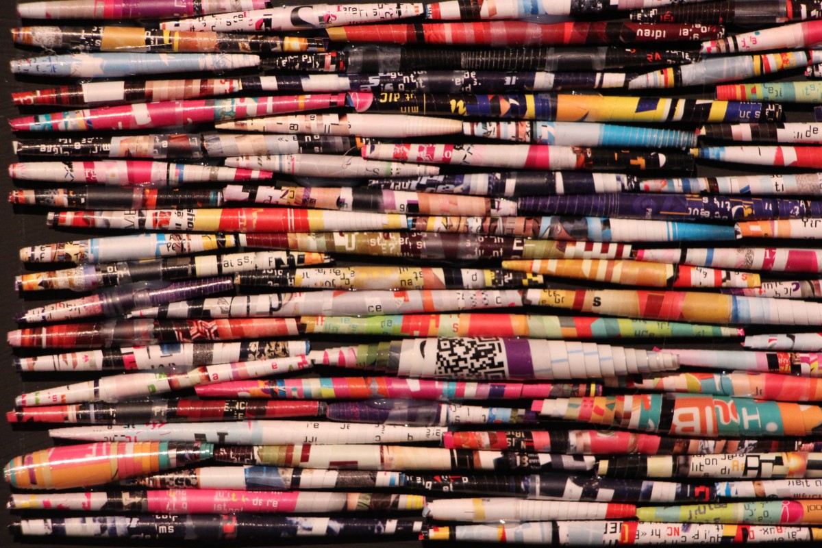 Une bibliothèque de magazines dont chaque page a été coupée et roulée. Une tablette représente une revue et une personne.