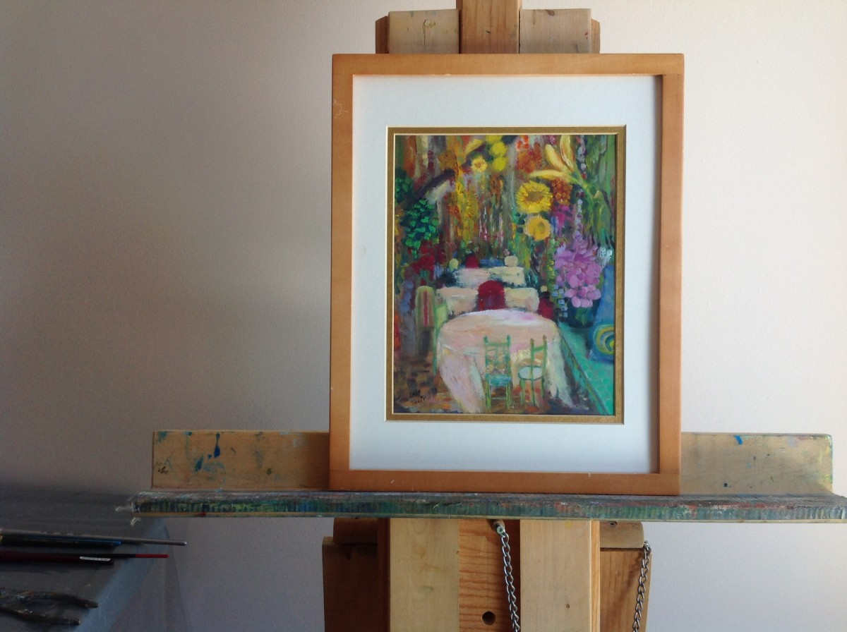 Encadrement sur vitre. Pastel à l'huile et huile sur papier.
