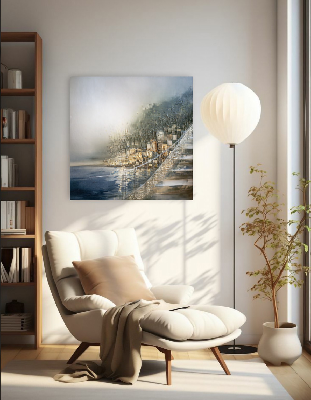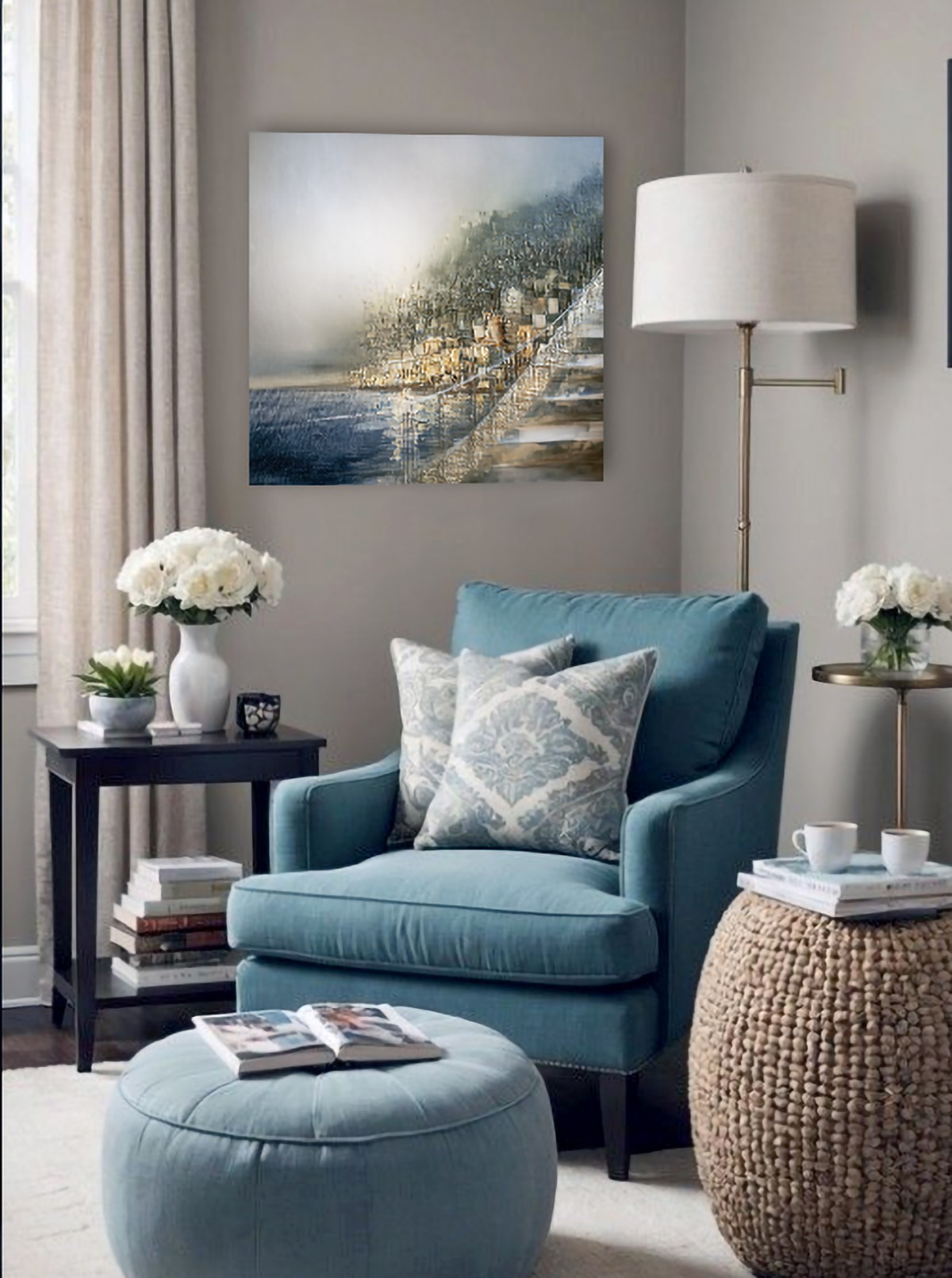 This space is between what already is and what you are moving toward. The painting is filled with a stillness in which it is easy to breathe. It invites you to pause and feel your inner shore.