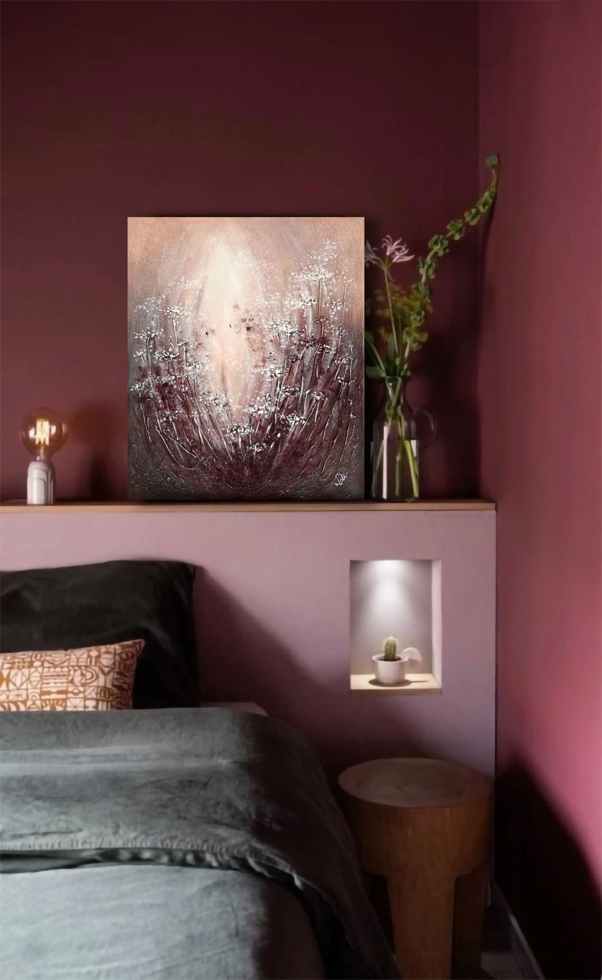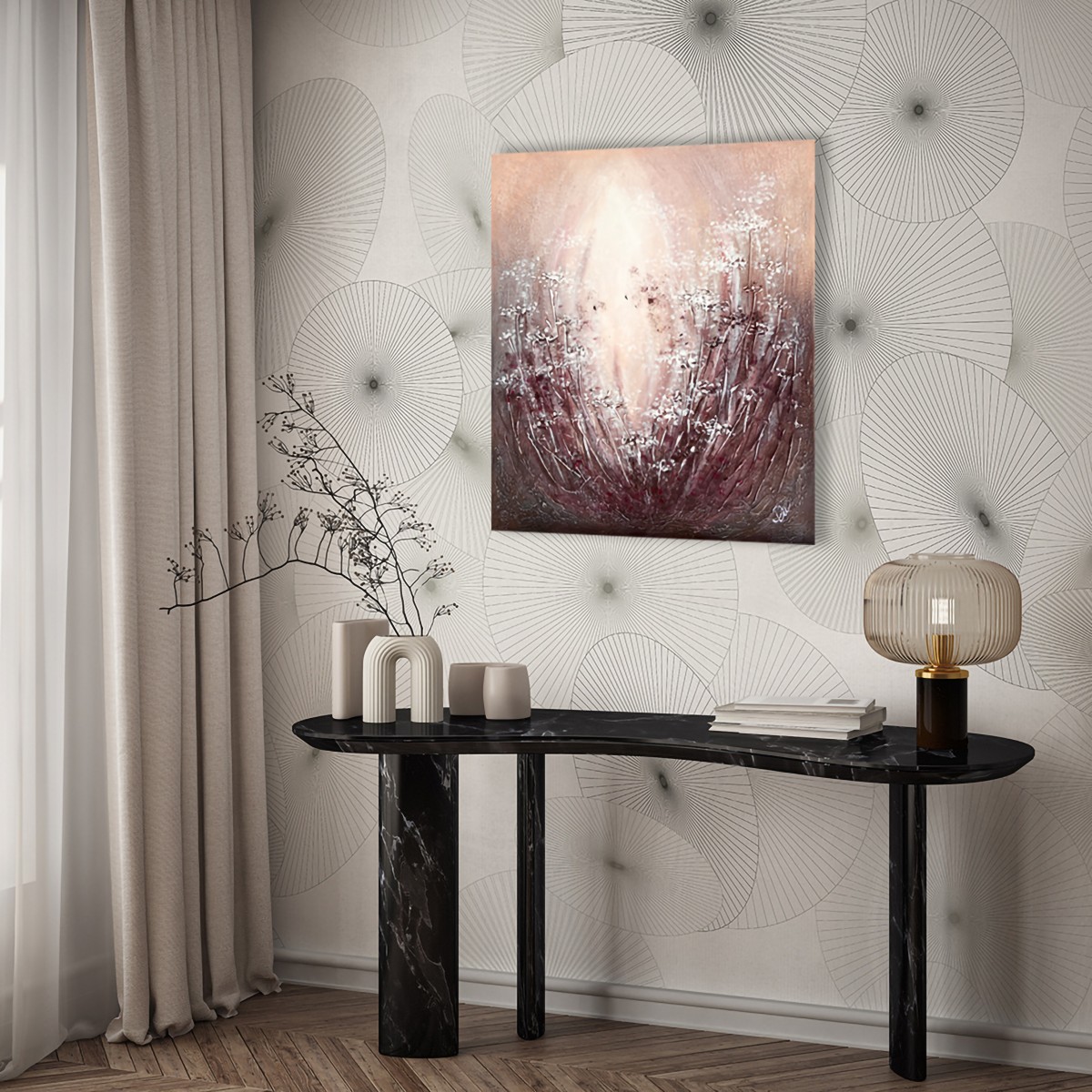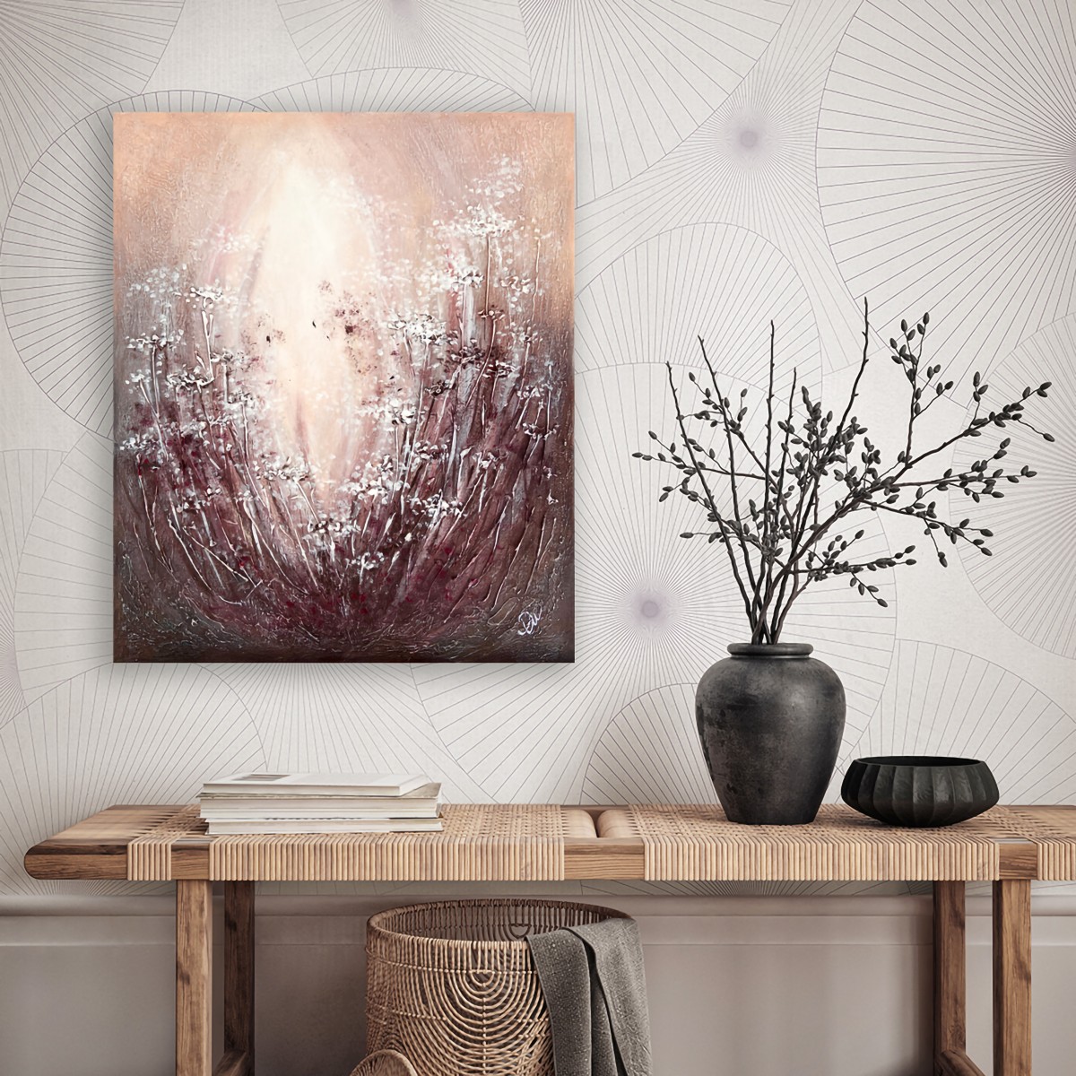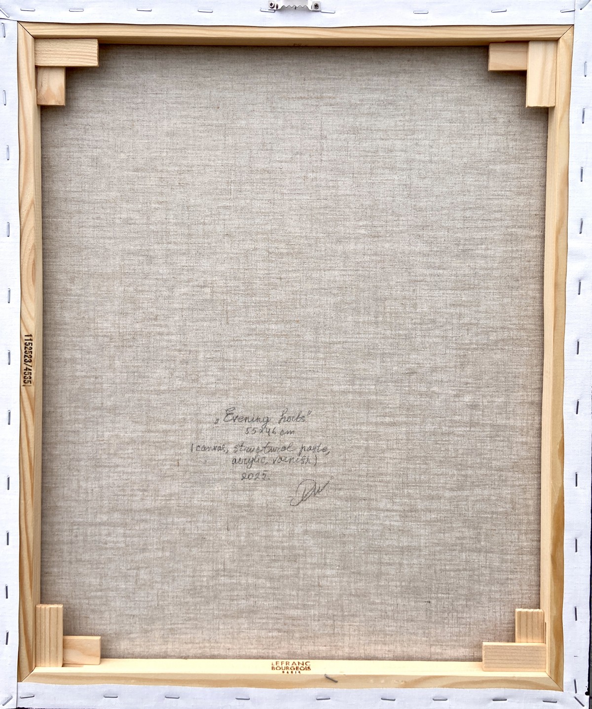 Structural paste is applied to a 55cm x 46cm canvas, then acrylic paint, and a protective layer of varnish completes the painting.