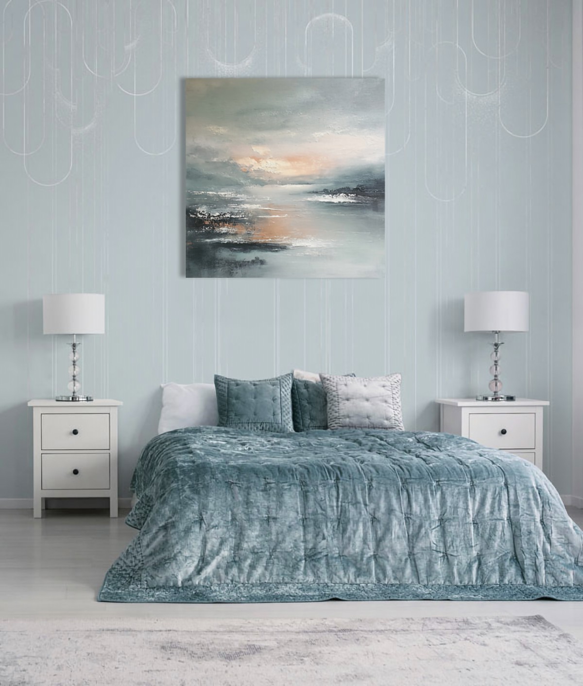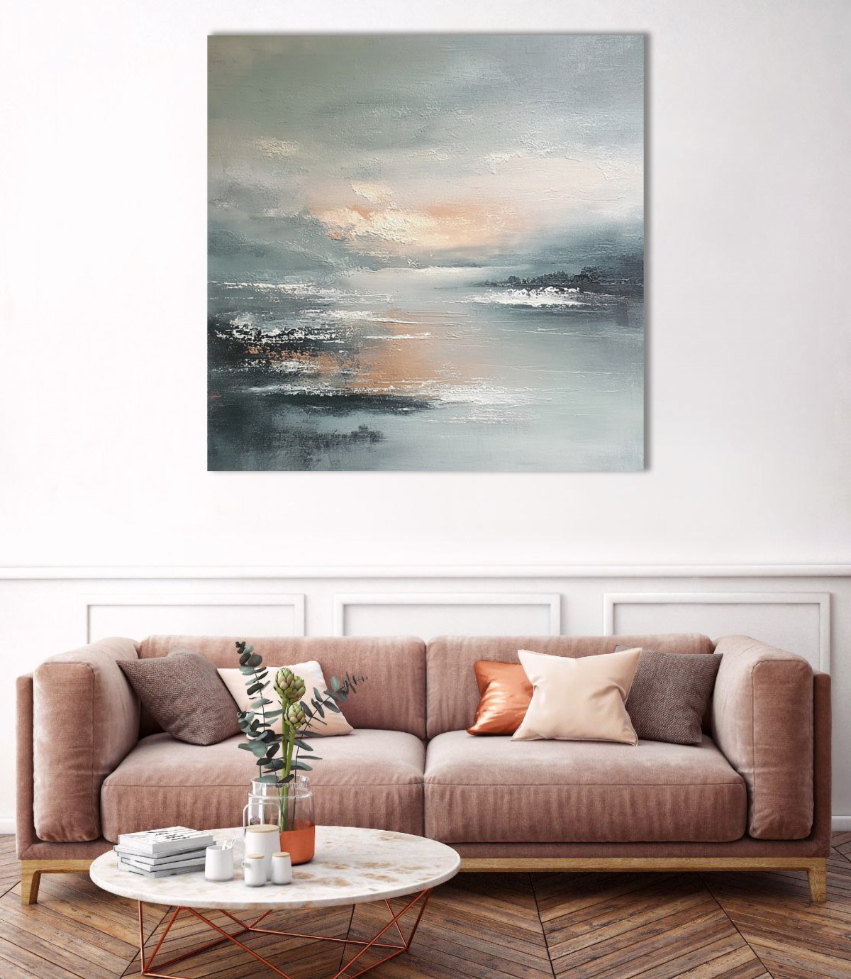 The horizon almost disappears, dissolving into air and water. The texture resembles the traces of waves and the gentle movement of the wind. Soft layers create a calm, slightly blurred surface. The work is dominated by shades of gray-blue, milky white, warm beige, and muted pink.