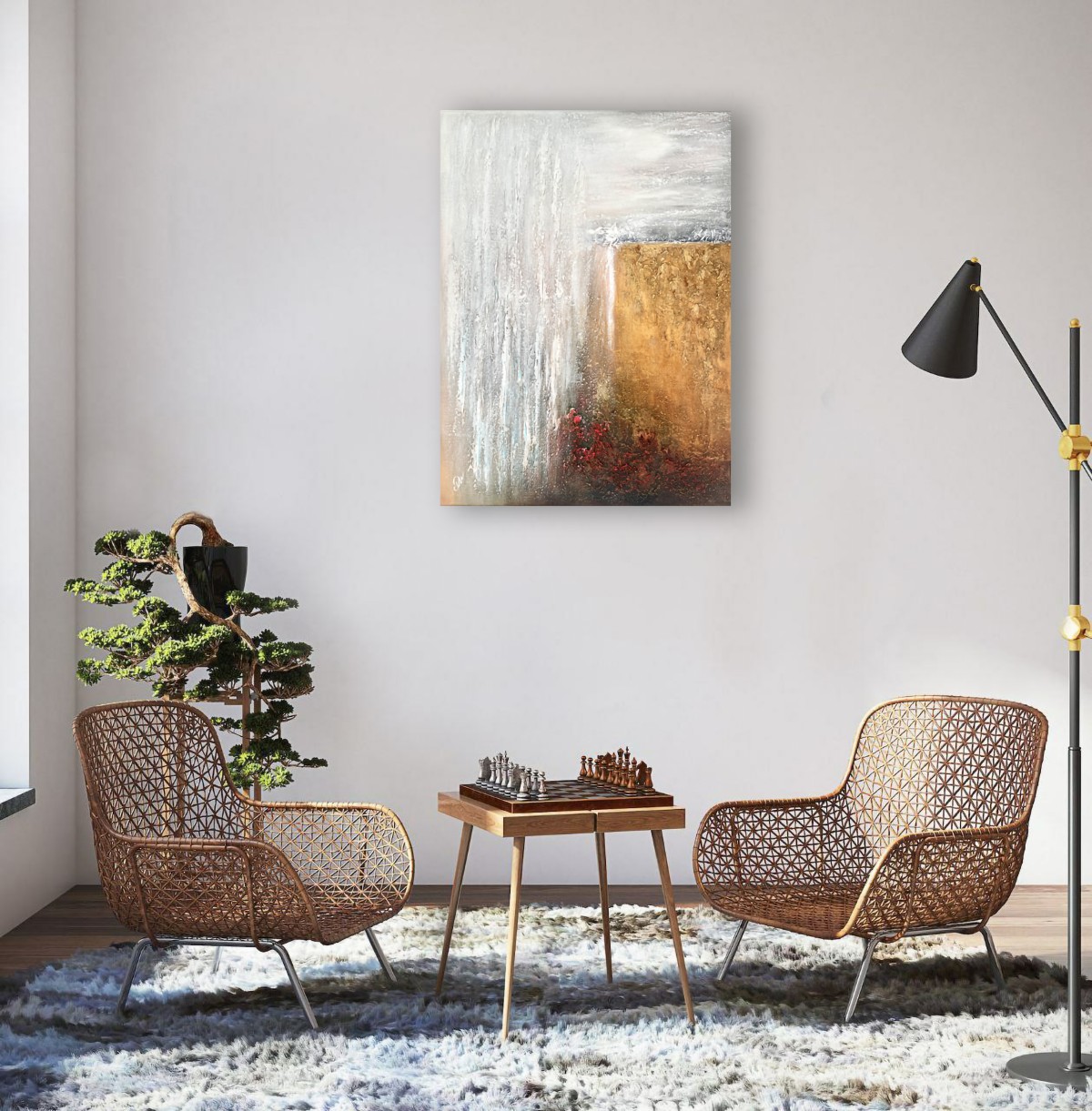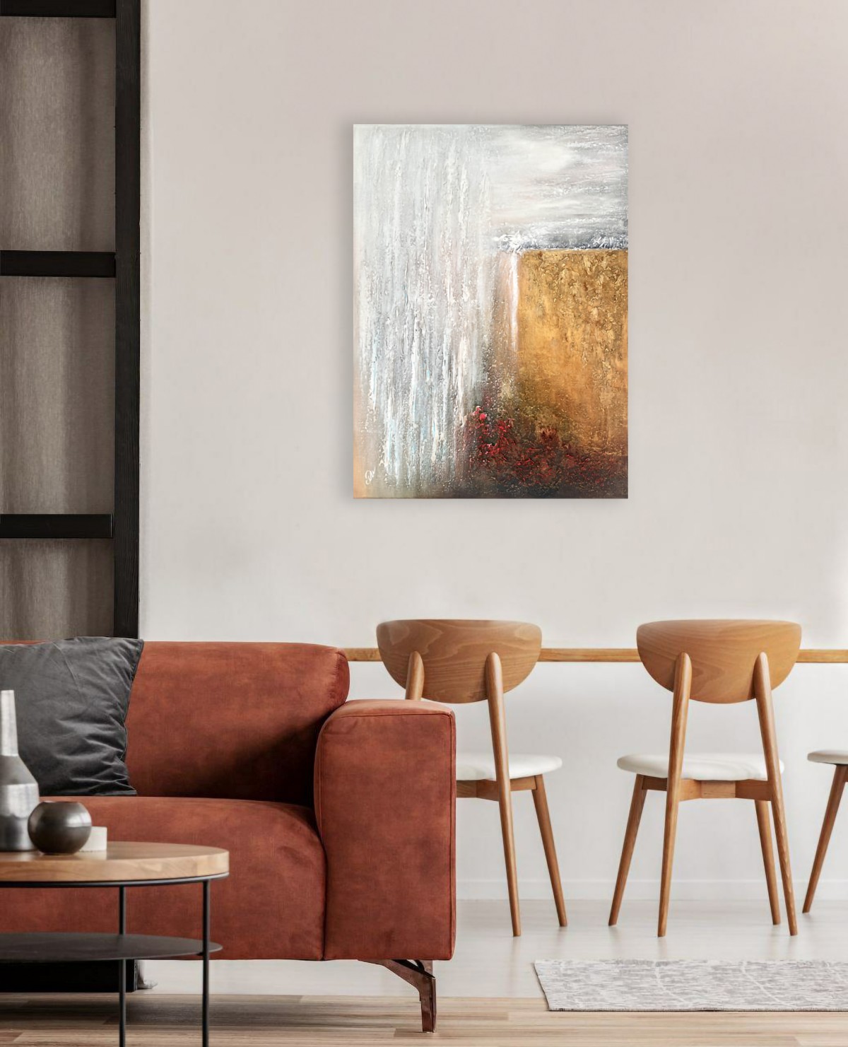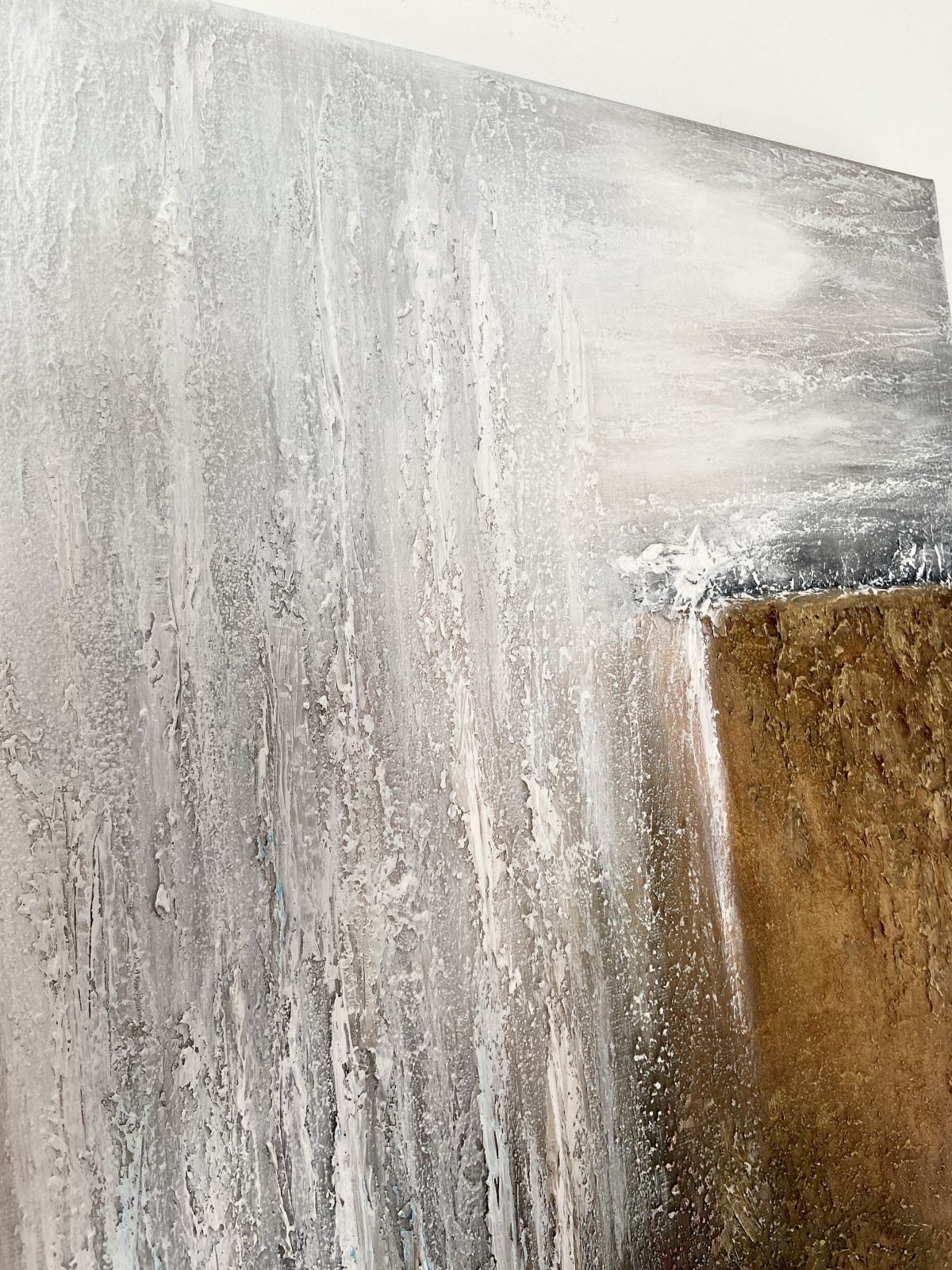 Acrylic paints emphasize the depth of the earth and the movement of light. Natural tones — from soft grays to golden browns — bring harmony and warmth. Each layer of texture seems to breathe and carry the energy of the elements. The artwork reminds us of the eternal bond between humans and the earth. You can feel the breath of the wind, the weight of the rocks, and the warmth of the light. The balance of light and shadow creates a sense of presence and peace. This piece evokes respect and admiration for nature’s power. Perfect for interiors that value grounding energy and natural balance.