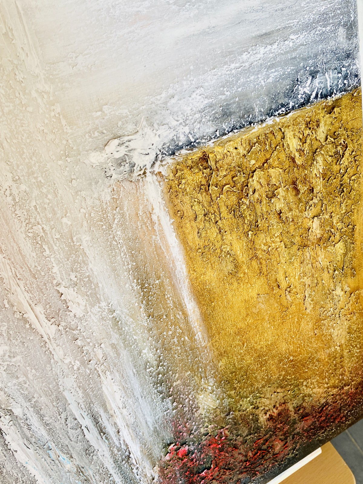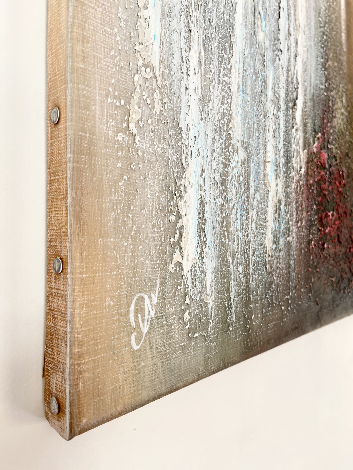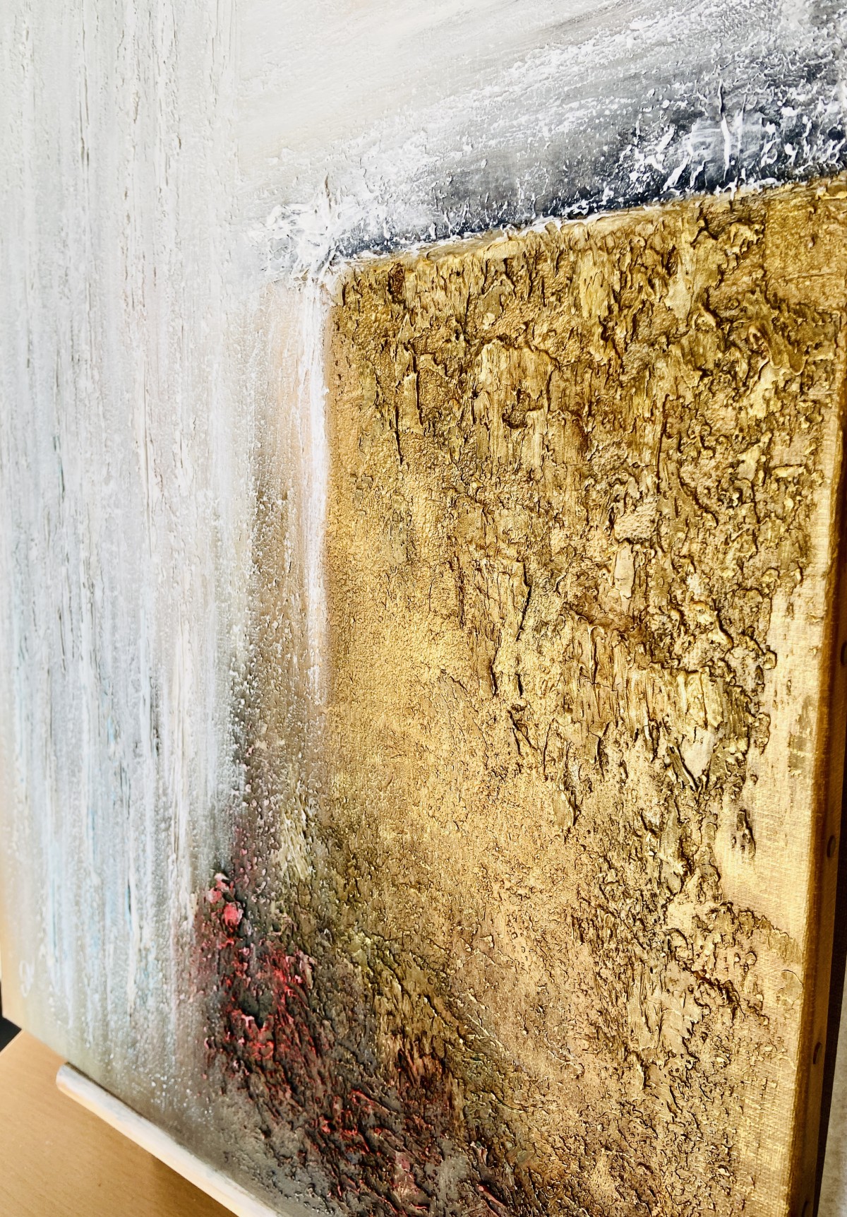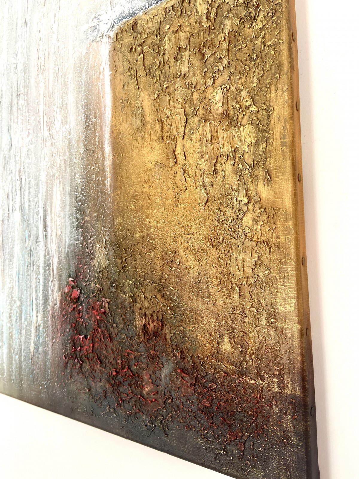 Structural paste is applied to a 61cm x 46cm canvas, then acrylic paint, and a protective layer of varnish completes the painting.