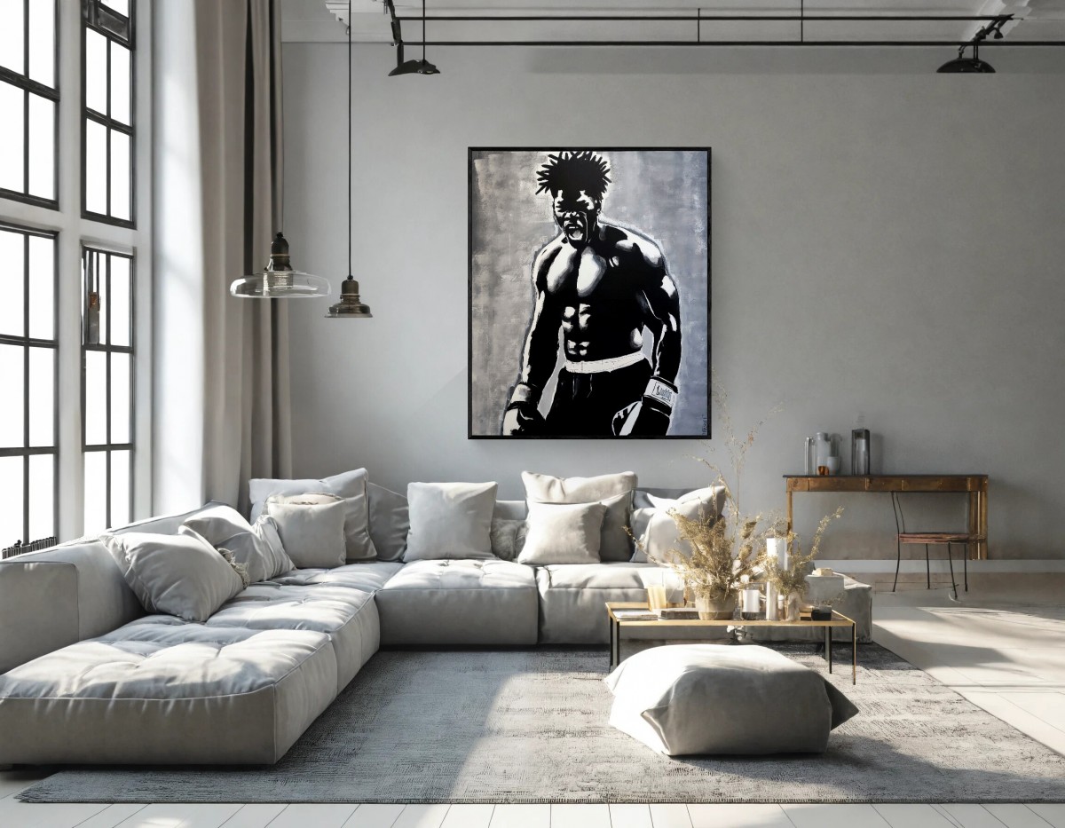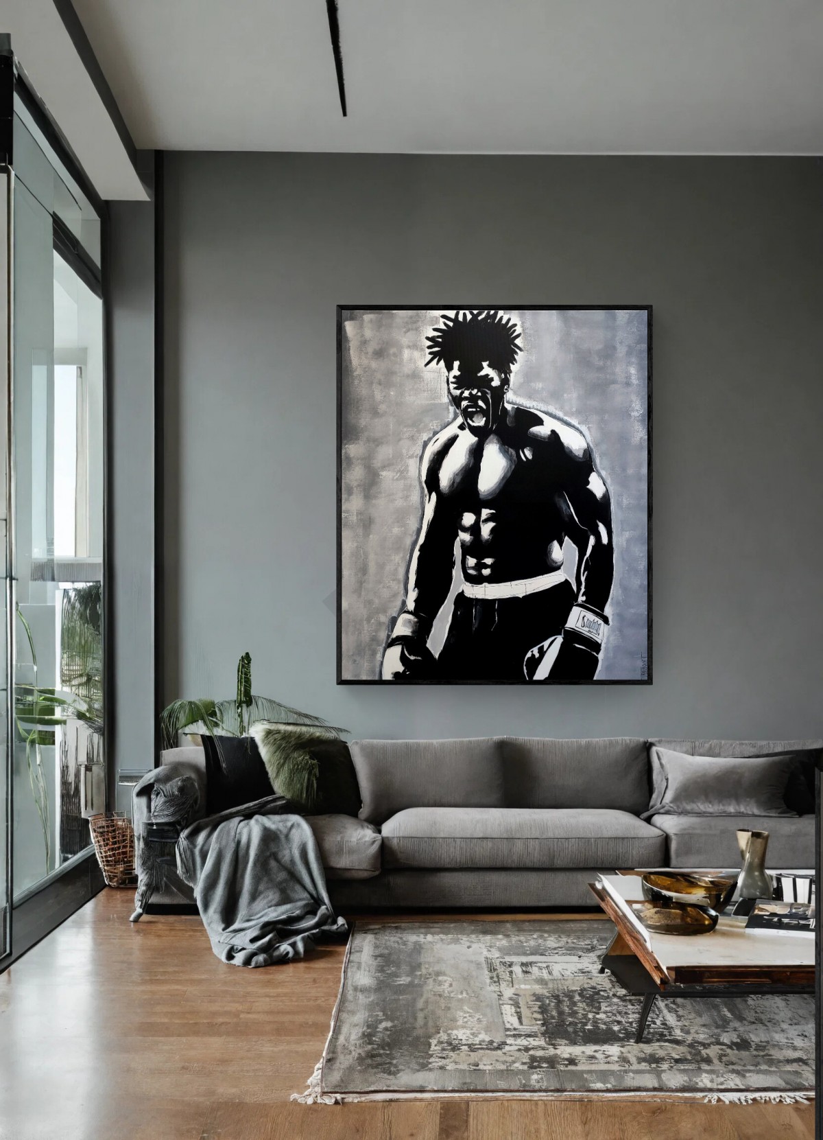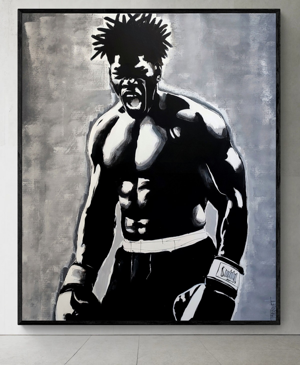 Une grande peinture acrylique sur toile , format 100/80 cm . J'ai voulu exprimer le sentiment de victoire après s’être battu longtemps pour arriver à un objectif et enfin y parvenir ! quoi de mieux qu'un boxer pour symboliser ce combat et l'acceptation des coups reçus pour atteindre son but et pouvoir enfin se libérer et crier victoire ... Par Elie d'Oleron .