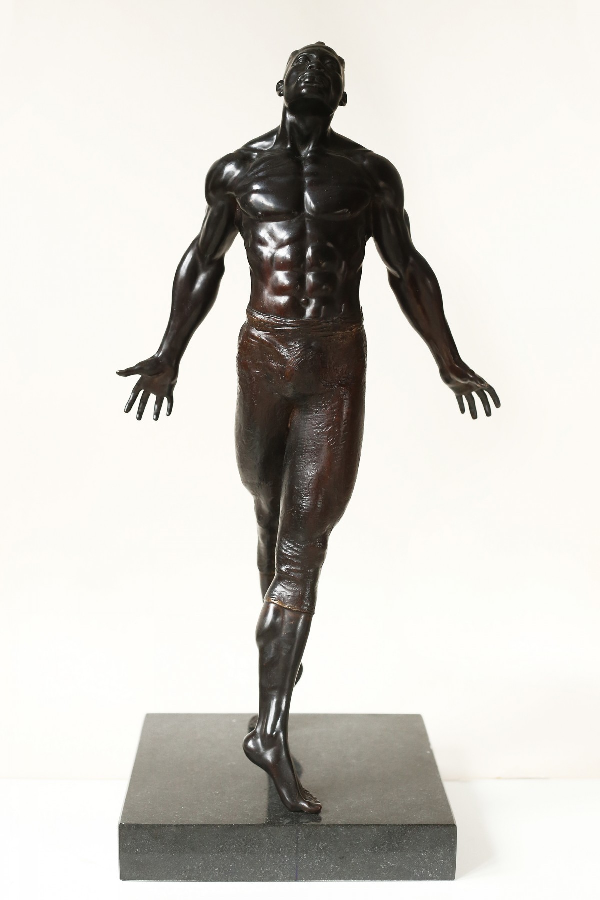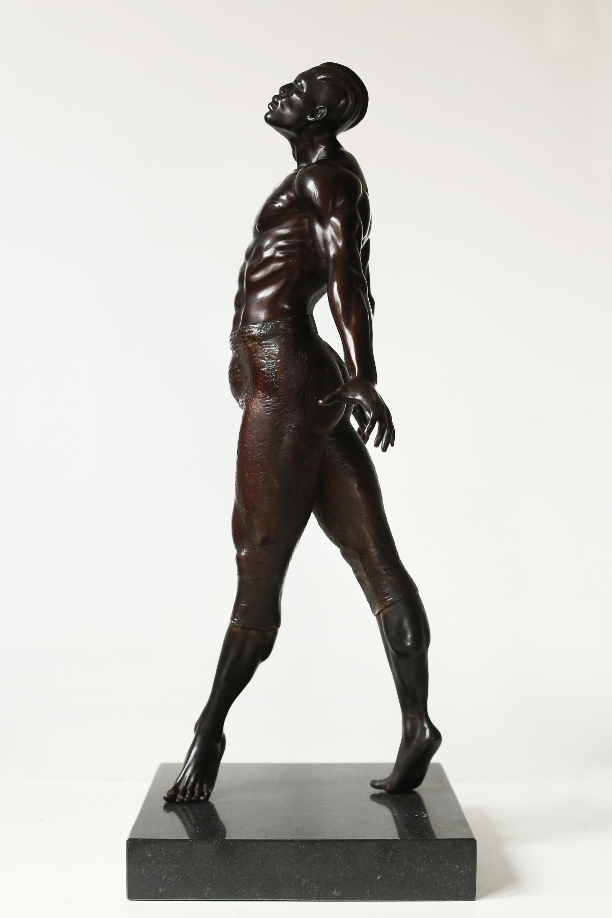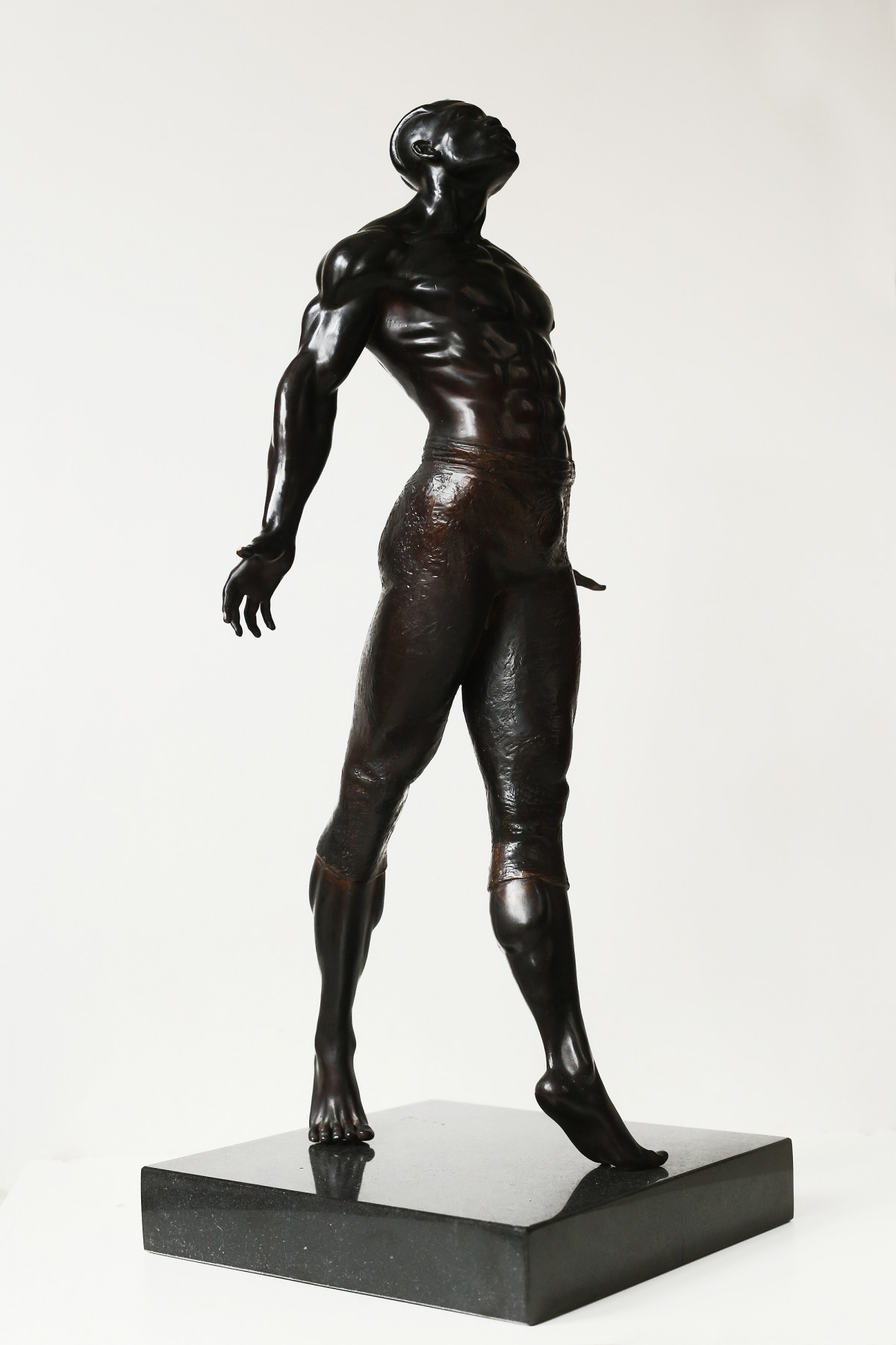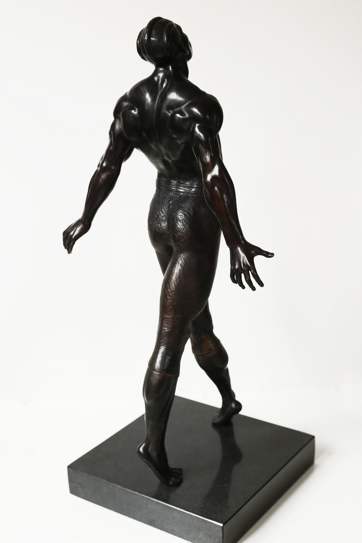 This original bronze sculpture on black granite base is one of my latest artworks. In creating this piece in bronze, I seeks to capture the raw, dynamic energy of human movement and strength. The fluidity and grace in the pose reflect resilience and power, while the texture and sheen of the bronze emphasize the sculpted intricacy of human form. Inspired to invoke a sense of awe and inspiration, this piece embodies a timeless celebration of physical and aesthetic human potential. It will bring a profound, inspiring presence to any space it graces.