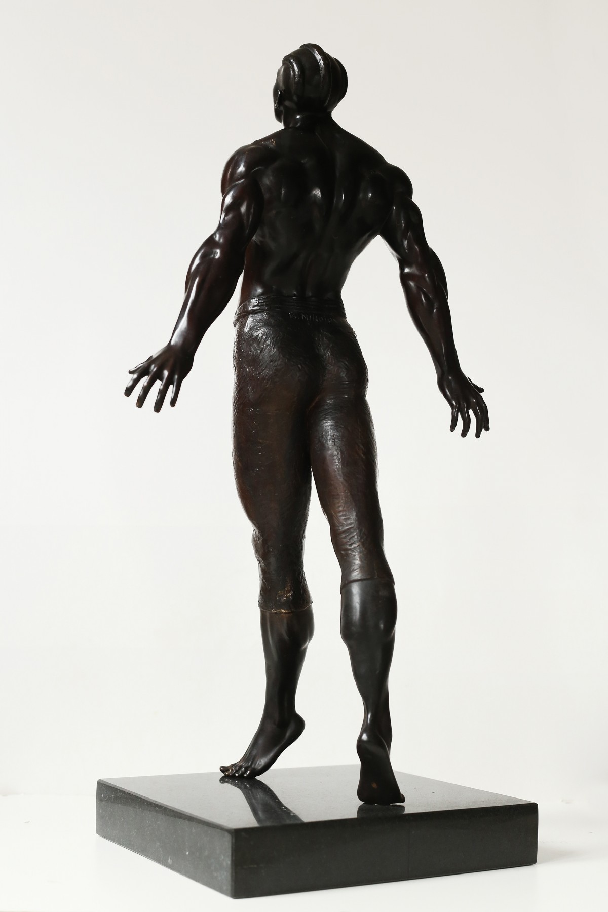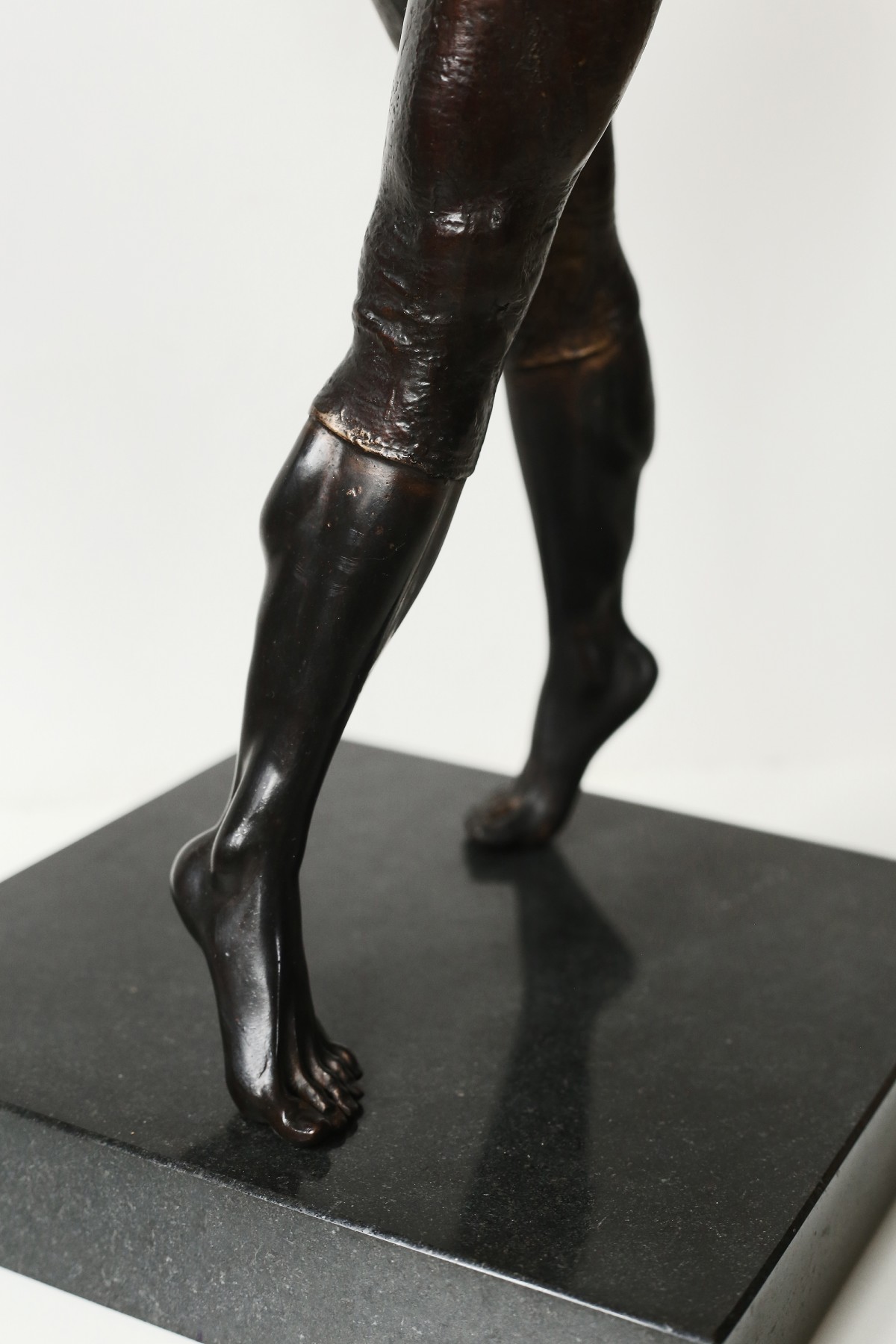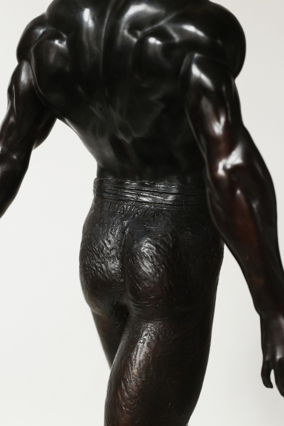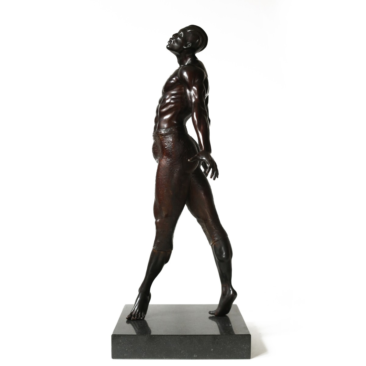 This original bronze sculpture on black granite base is one of my latest artworks. In creating this piece in bronze, I seeks to capture the raw, dynamic energy of human movement and strength. The fluidity and grace in the pose reflect resilience and power, while the texture and sheen of the bronze emphasize the sculpted intricacy of human form. Inspired to invoke a sense of awe and inspiration, this piece embodies a timeless celebration of physical and aesthetic human potential. It will bring a profound, inspiring presence to any space it graces.