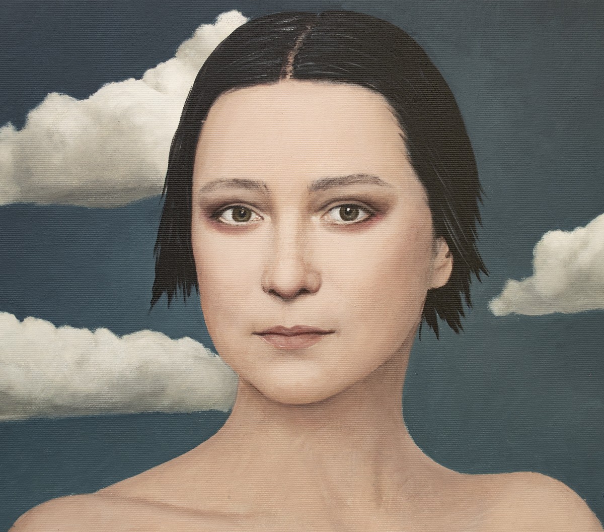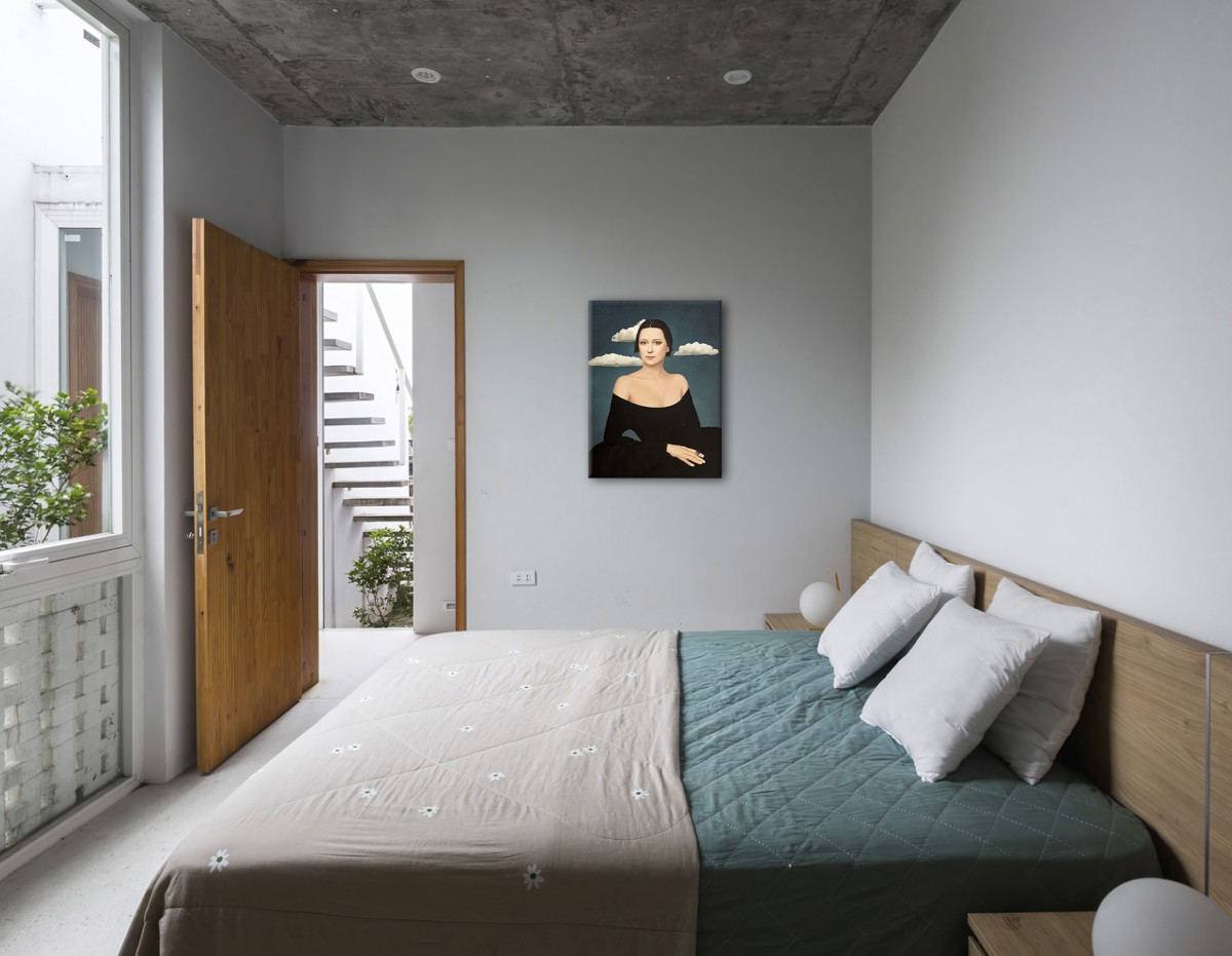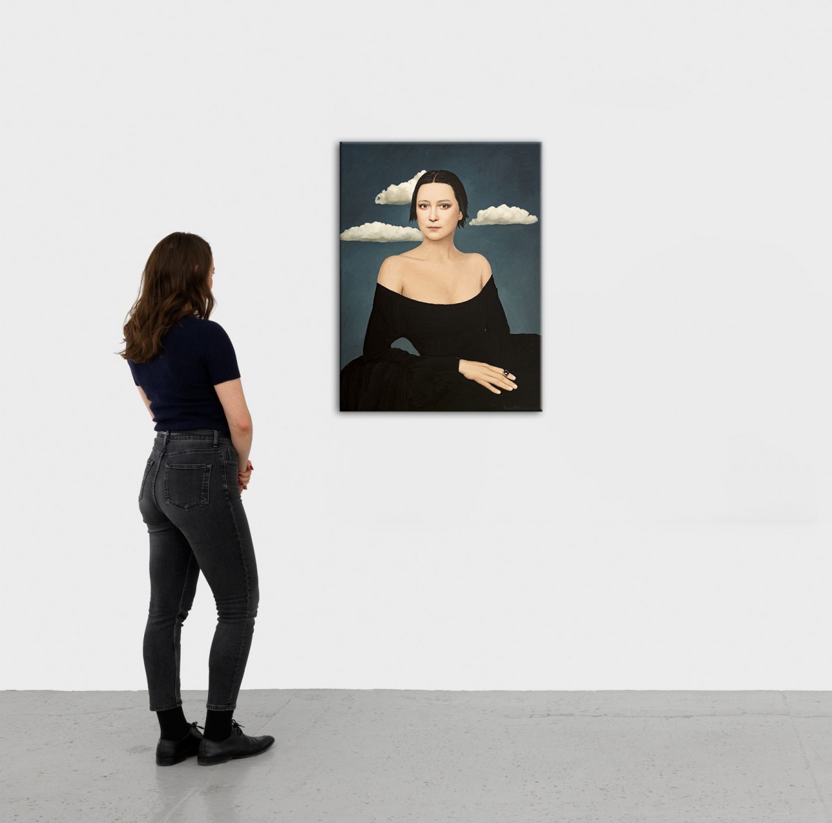 A contemplative portrait where realism meets surreal beauty. A woman dressed in black is set against a sapphire sky where clouds float like silent dreams. Her pale skin glows with delicate light, while her gaze—calm yet profound—carries a mystery that resonates deeply. The painting balances elegance and gravity, evoking emotions of nostalgia, longing, and peace. The surreal clouds suggest fleeting thoughts or unspoken secrets, adding poetic depth to the minimalist composition. More than an image, it is a silent dialogue with the viewer, a timeless reminder of the delicate line between reality and imagination.