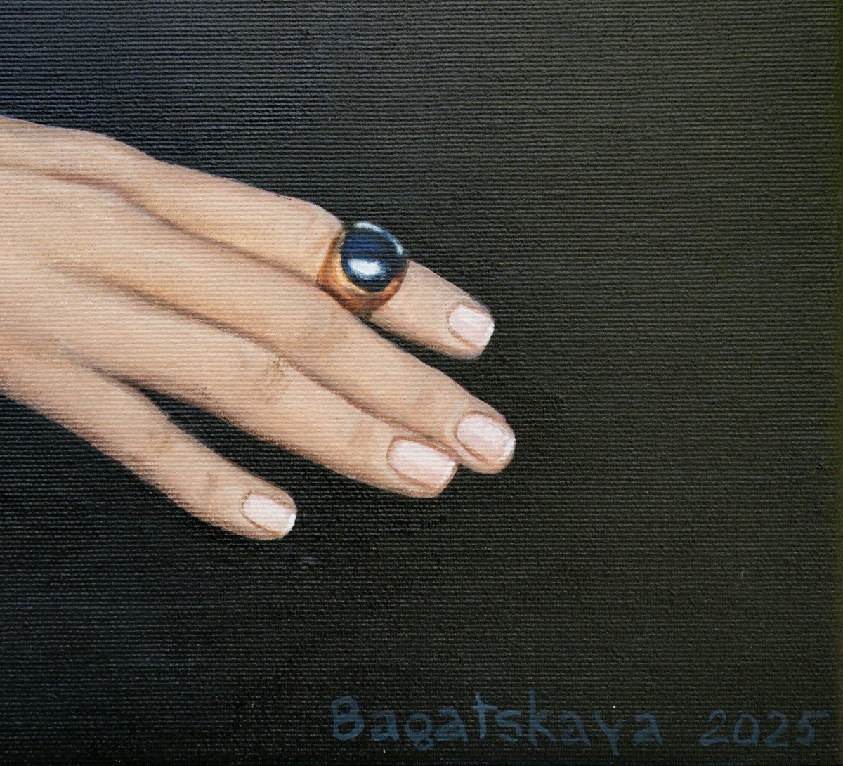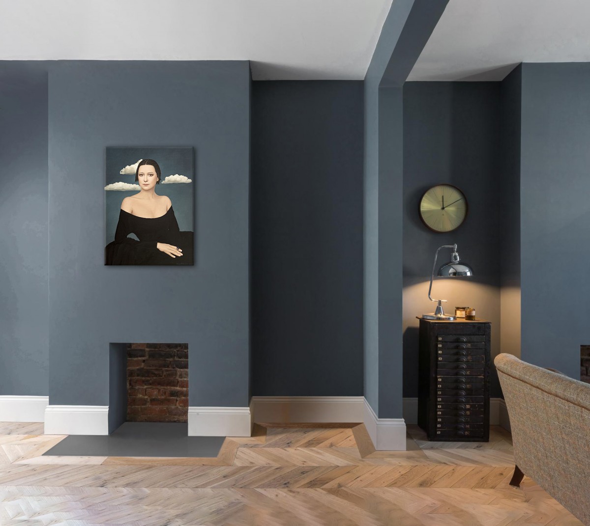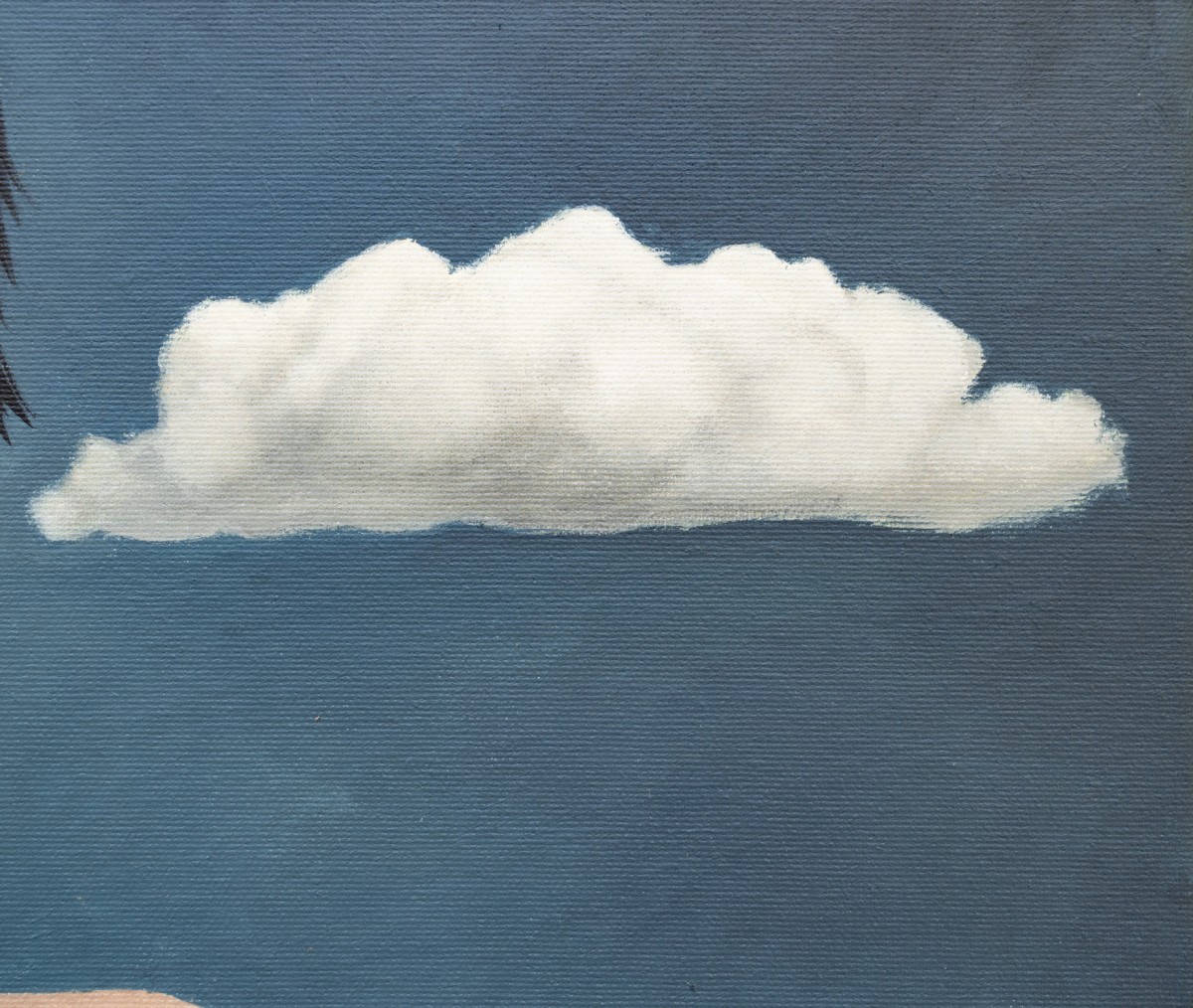 A contemplative portrait where realism meets surreal beauty. A woman dressed in black is set against a sapphire sky where clouds float like silent dreams. Her pale skin glows with delicate light, while her gaze—calm yet profound—carries a mystery that resonates deeply. The painting balances elegance and gravity, evoking emotions of nostalgia, longing, and peace. The surreal clouds suggest fleeting thoughts or unspoken secrets, adding poetic depth to the minimalist composition. More than an image, it is a silent dialogue with the viewer, a timeless reminder of the delicate line between reality and imagination.