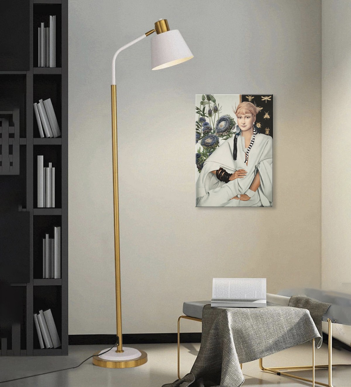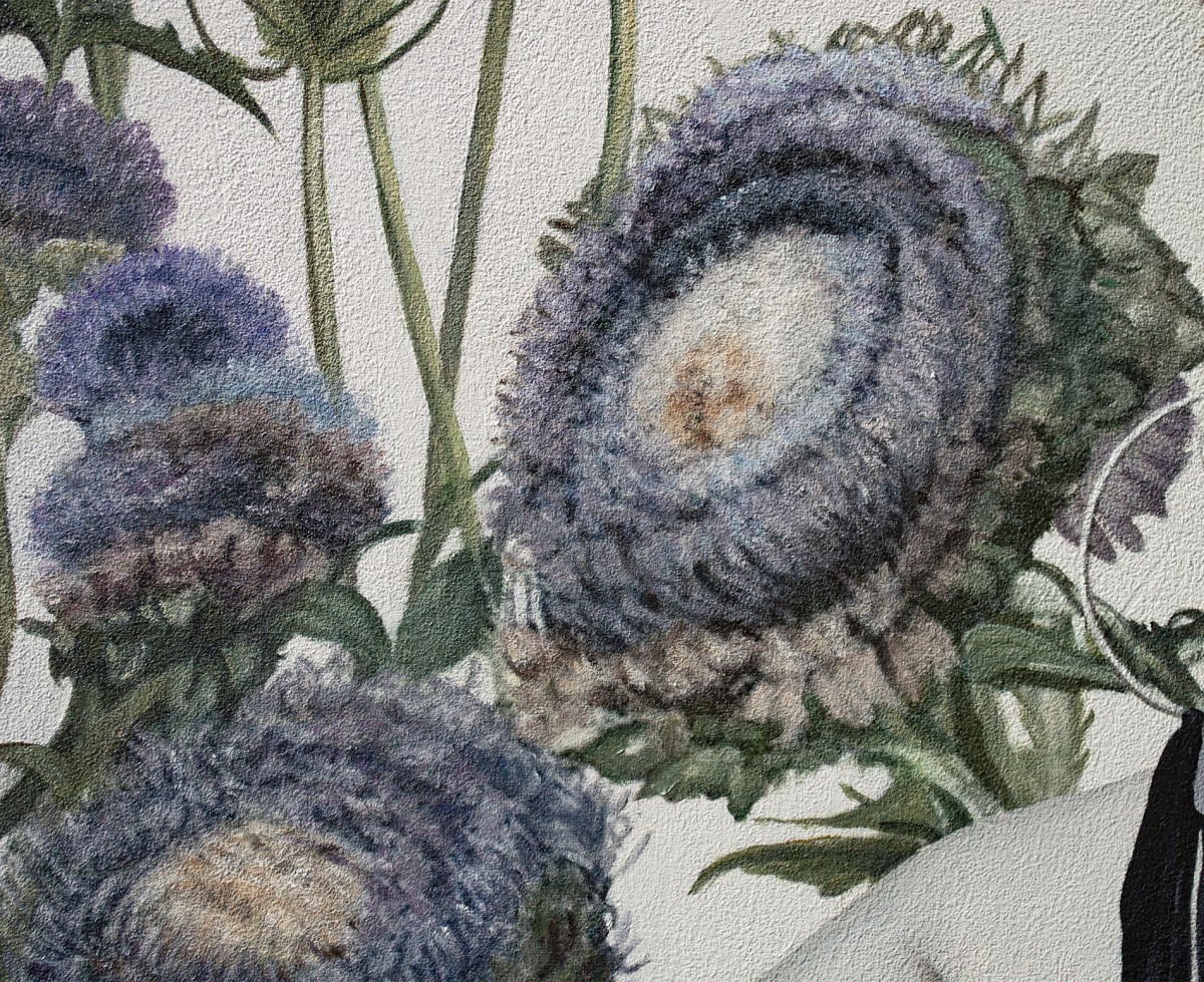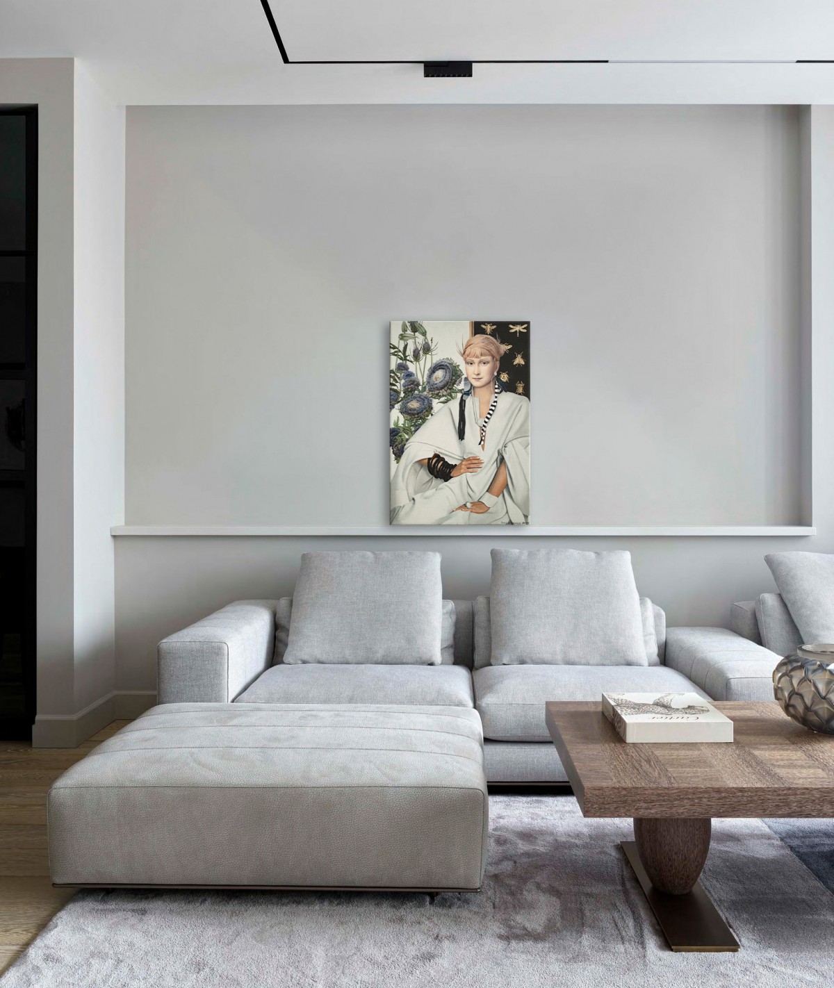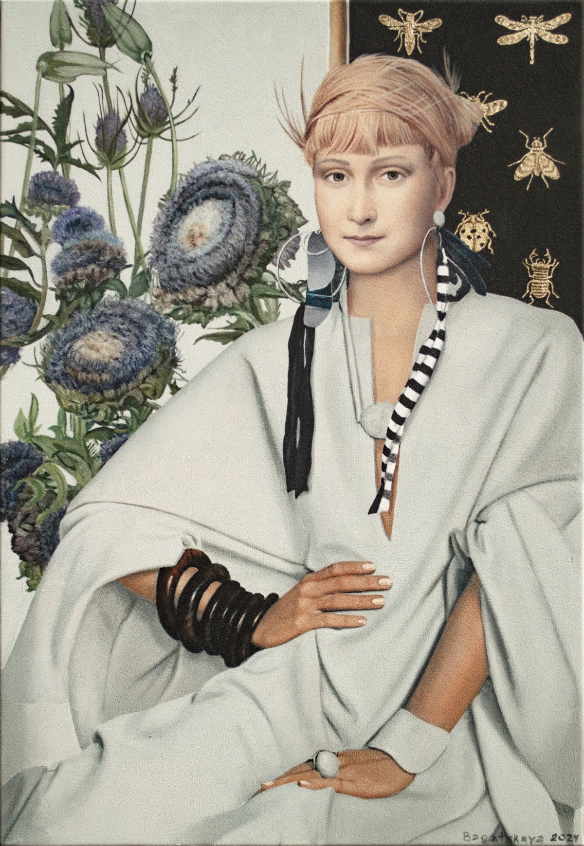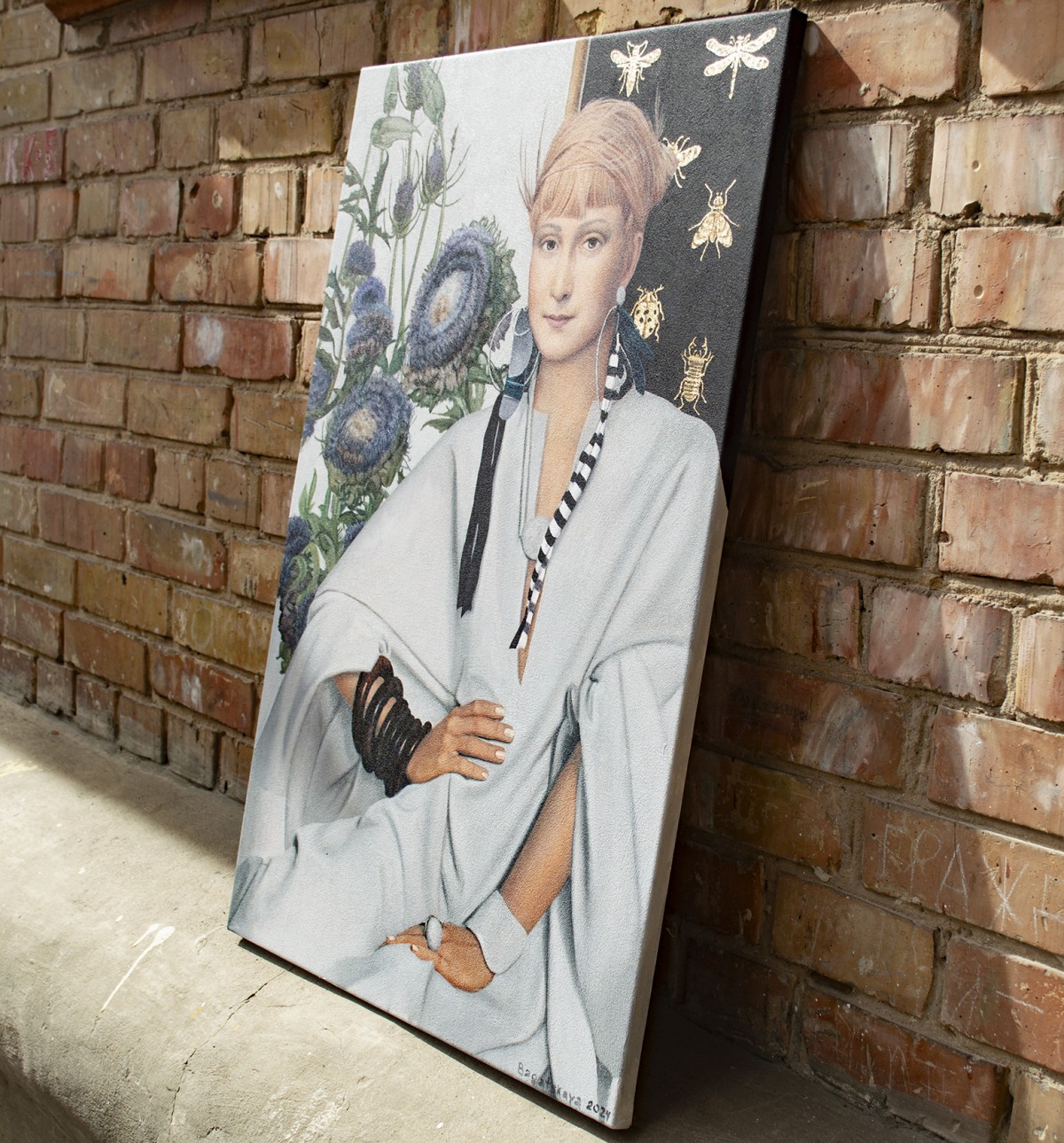 "In winter, we will go to the Natural History Museum," my husband said. Winter has passed, but we never went to the museum.In this painting, I've interwoven the essence of nature's intricacies with human introspection. The fusion of acrylic and oil breathes life into the subject, draped in tranquility, amidst a realm of floral and entomological motifs. This piece is a silent conversation, symbolic of our interconnectedness with the natural world, aiming to evoke a profound sense of contemplation and harmony in your space.