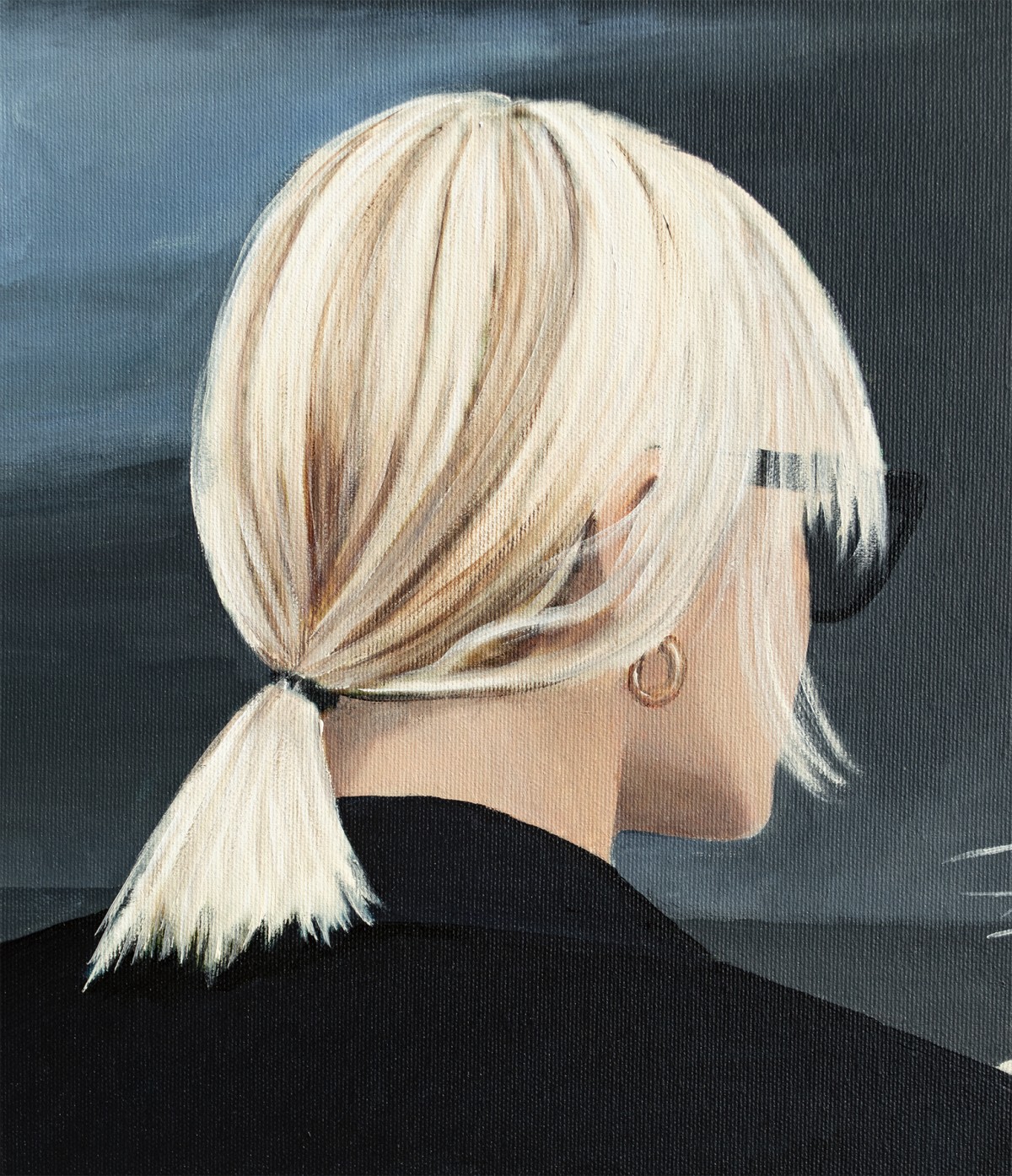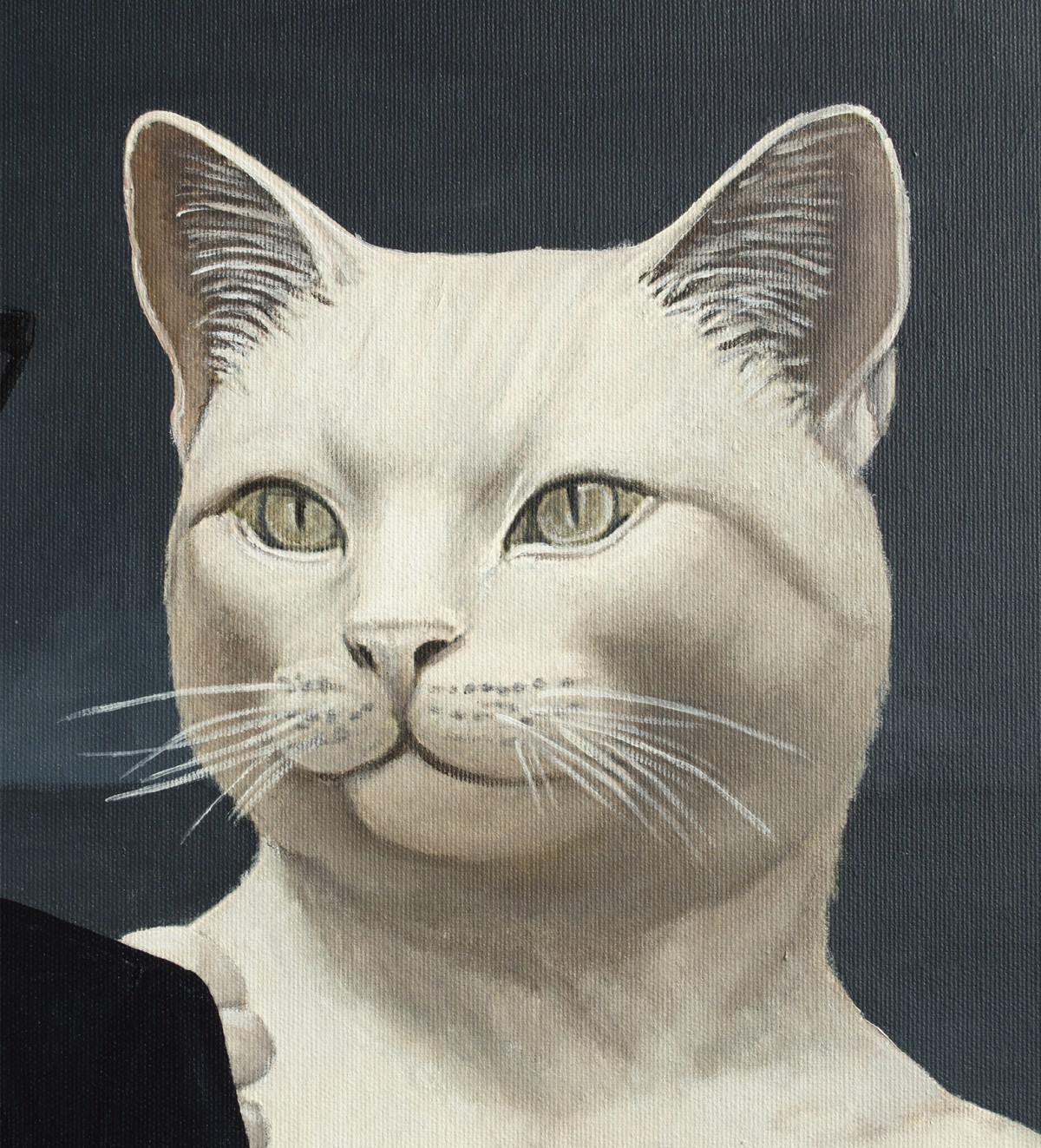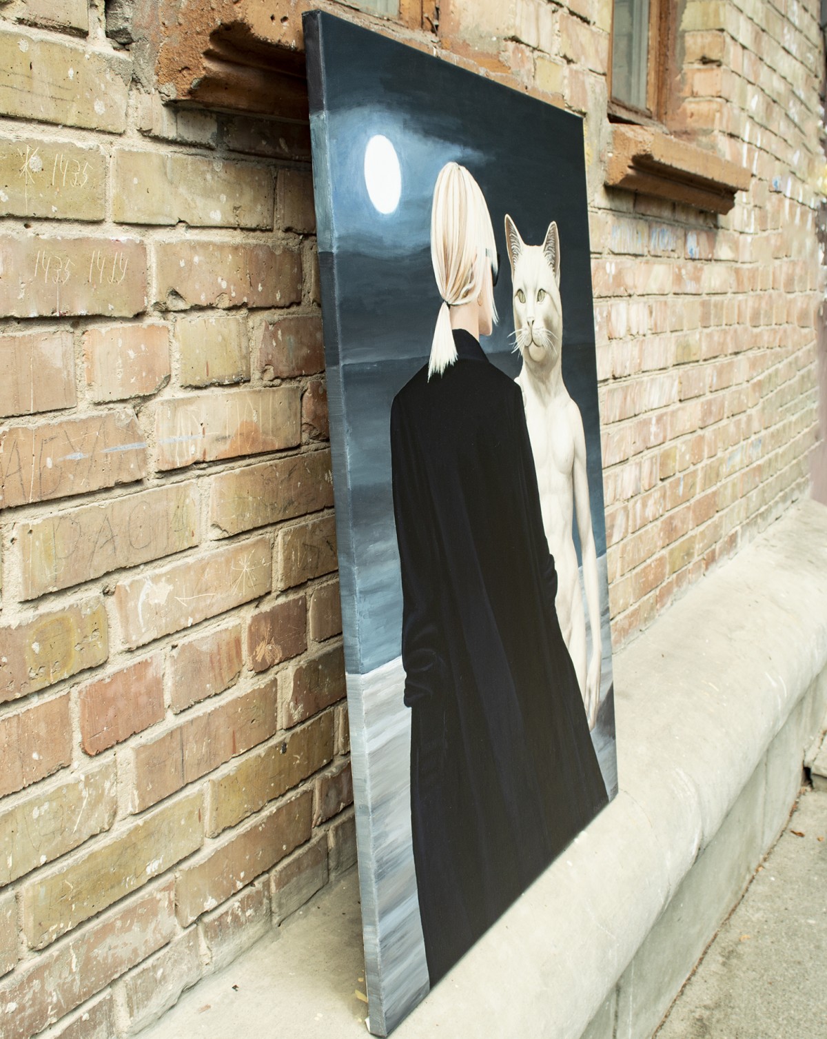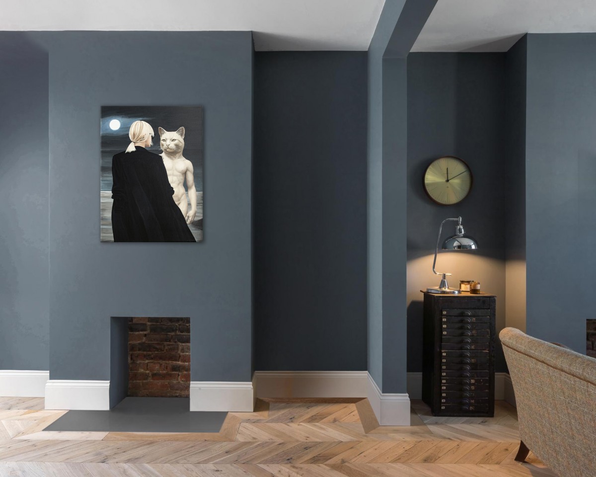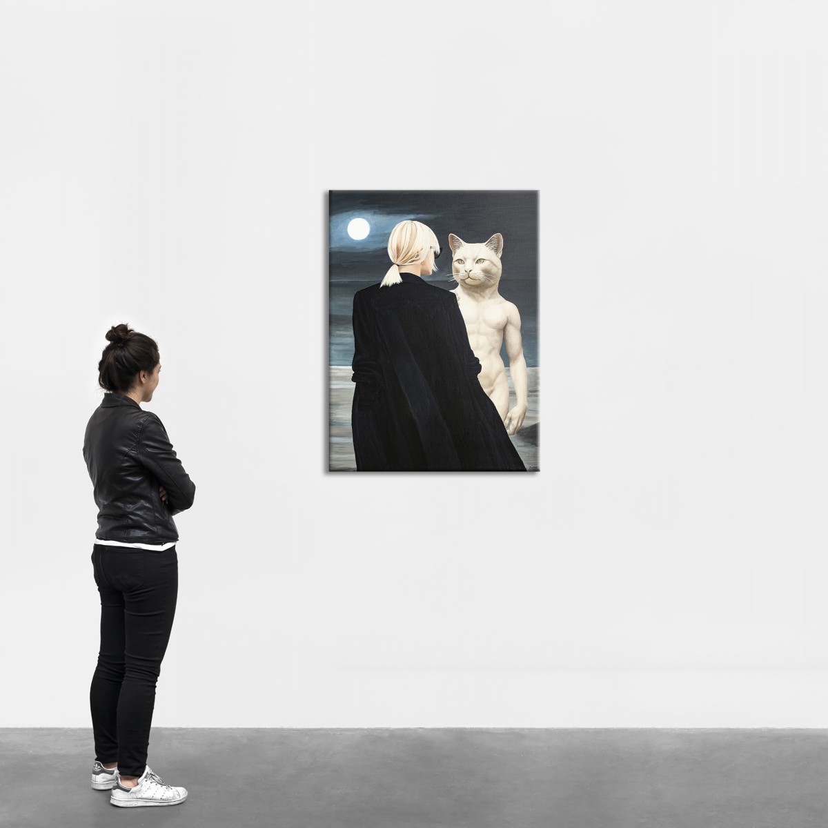 In this striking piece, the viewer is drawn into an enigmatic exchange between a human figure and an anthropomorphic feline, set against a moonlit seascape. The fine detail of the cat’s human-like body and the subtlety of the backlit hair of the figure in black add layers of intrigue and artistry. The minimalist setting and cinematic perspective evoke themes of mystery, surrealism, and the subconscious. This work will make a bold statement in any contemporary art collection.