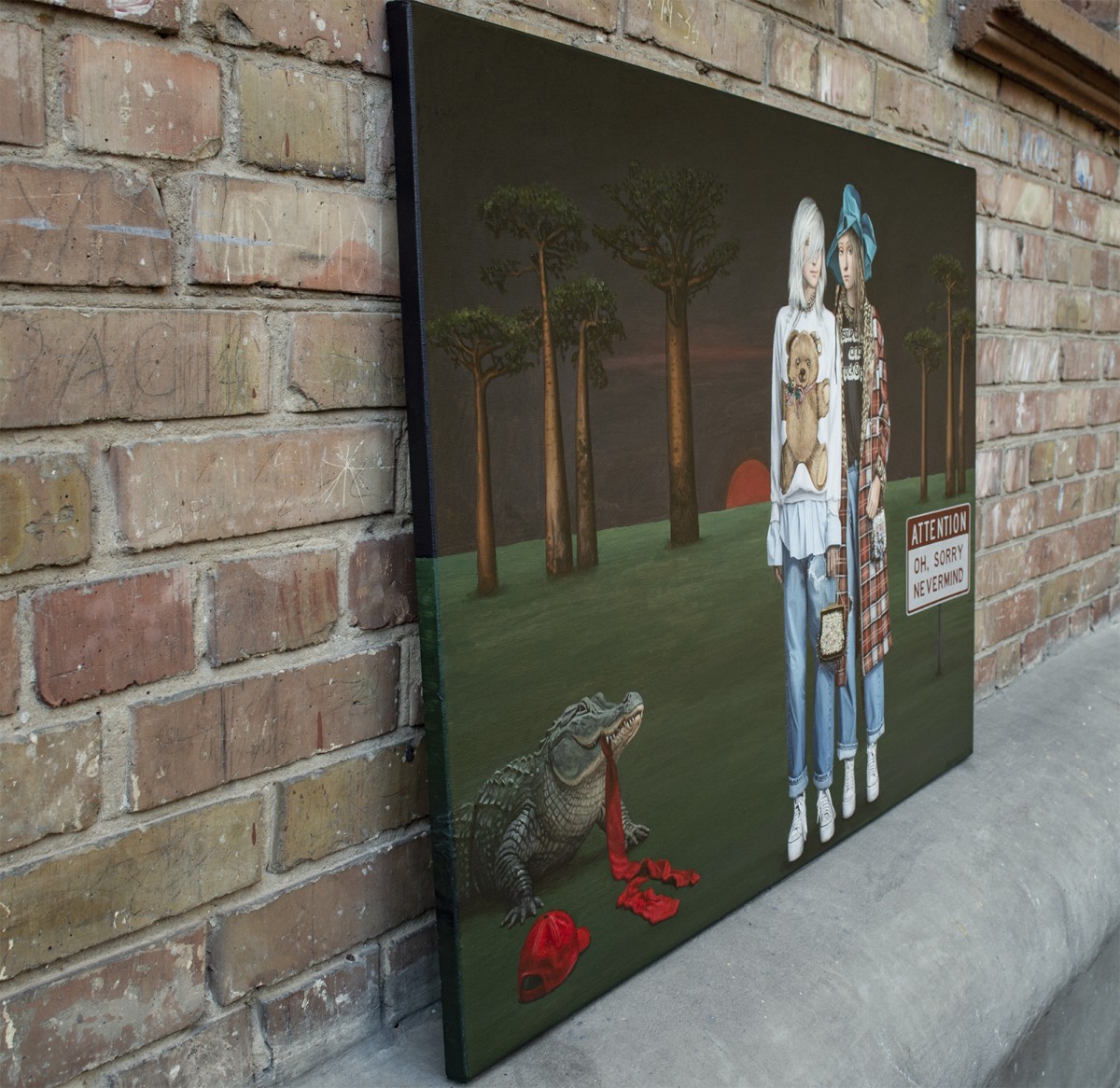 Step into a realm where youthful confidence meets untamed nature and quiet symbolism. Two fashion-forward figures stand beneath a darkening sky, framed by ancient baobabs and the fading red of sunset. Their playful attire — teddy-bear sweater, plaid coat, oversized turquoise bow — contrasts with a crocodile creeping in with a scarlet ribbon in its jaws. Nearby, a red cap and tie rest on the ground — subtle relics of power, hinting at political theatre and the myths it creates. The ironic sign “ATTENTION OH, SORRY NEVERMIND” transforms the scene into a surreal allegory on leadership, illusion, and collective forgetfulness.