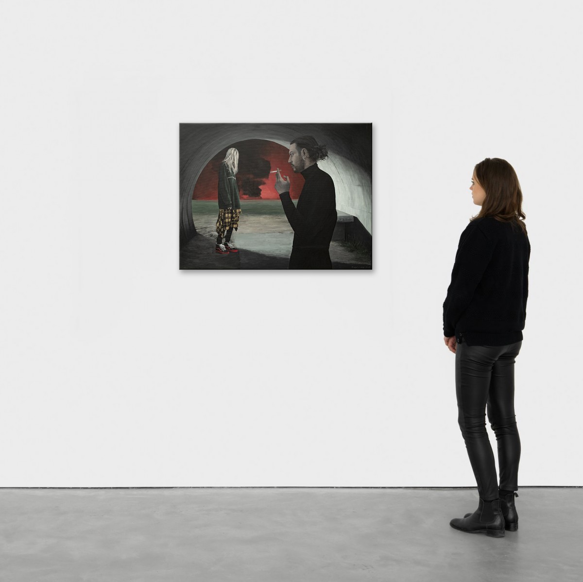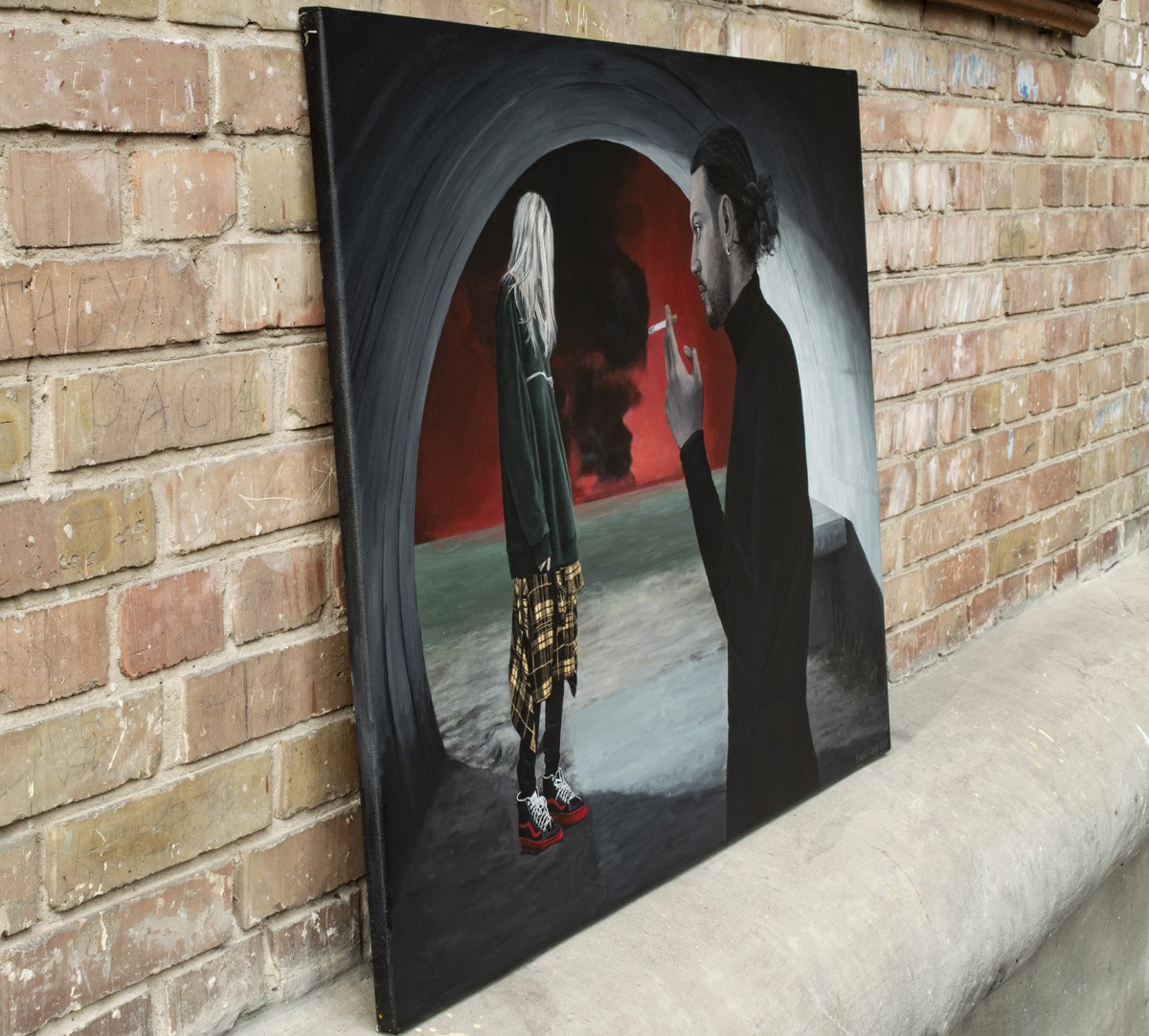 Beneath a tunnel, two figures linger in deceptive peace — a man lighting his cigarette, a woman lost in thought. Behind them, the red horizon burns with fire and smoke from the bombardments in Ukraine. They appear safe, yet danger is near; their calm is built on fragile illusion.